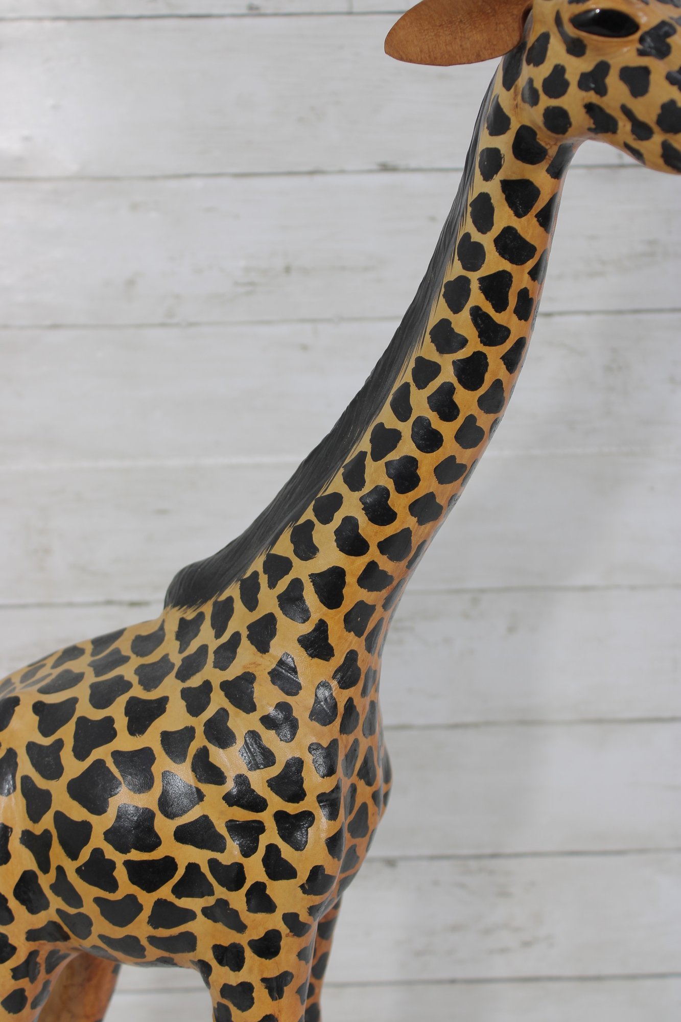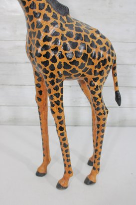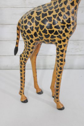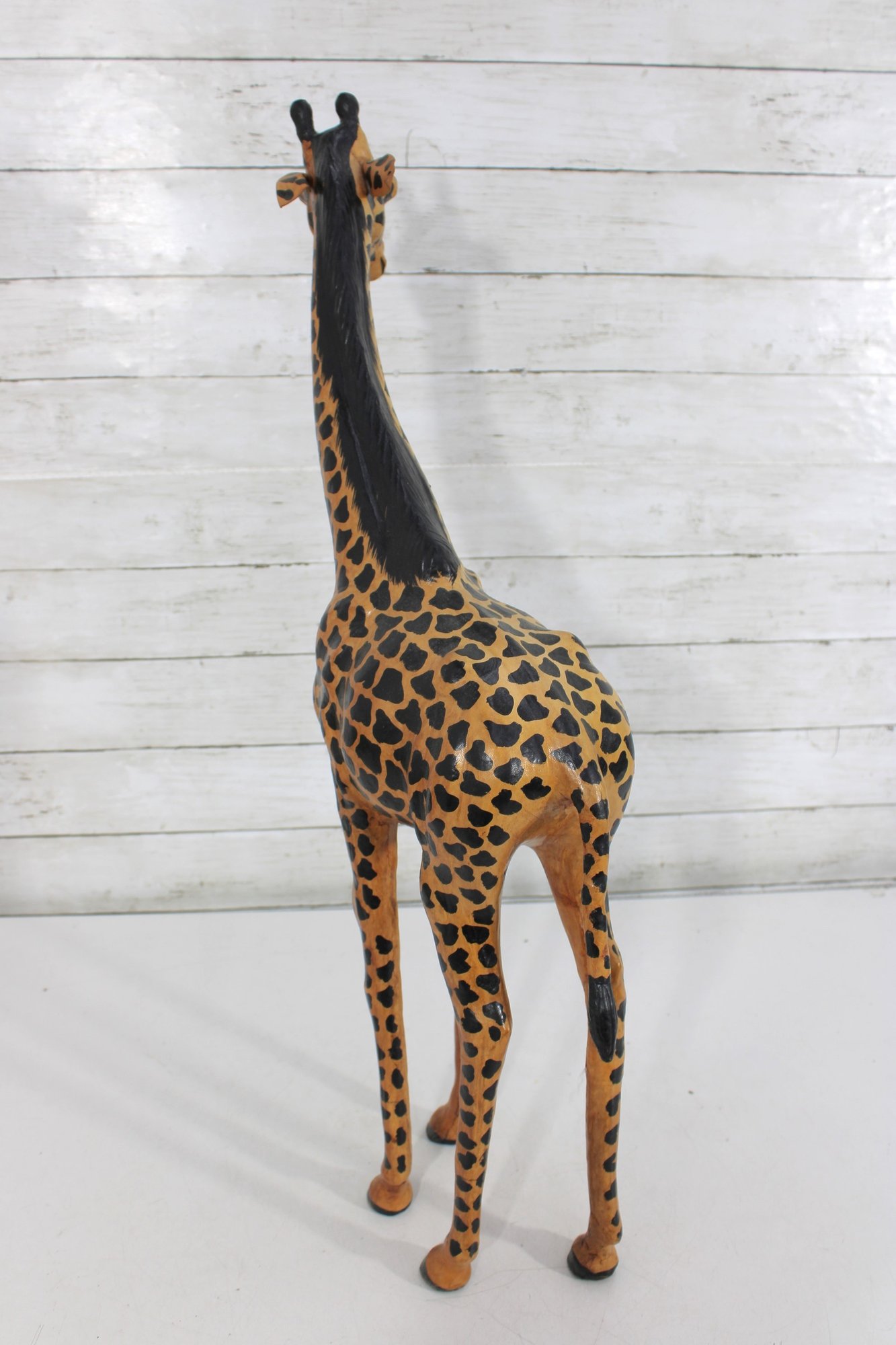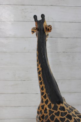 The giraffe is finished in warm golden tones with dark, hand-painted spots and black detailing along the mane and horns. The slightly stylized carving and visible brushwork give it an artisan, folk art feel rather than a mass-produced look. Its upright posture and slender legs make it a perfect vertical accent without overwhelming a room.