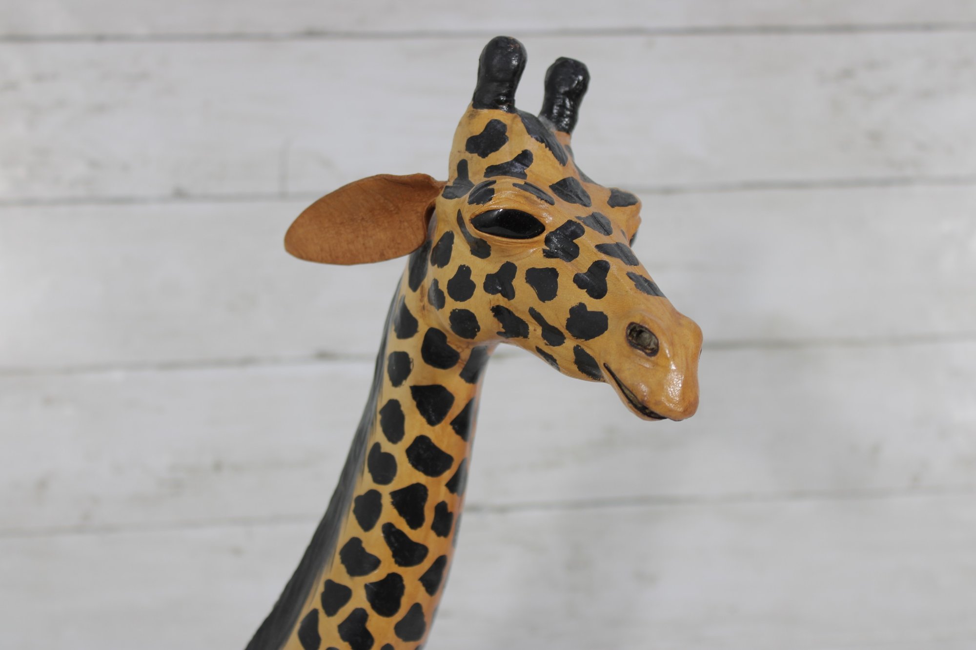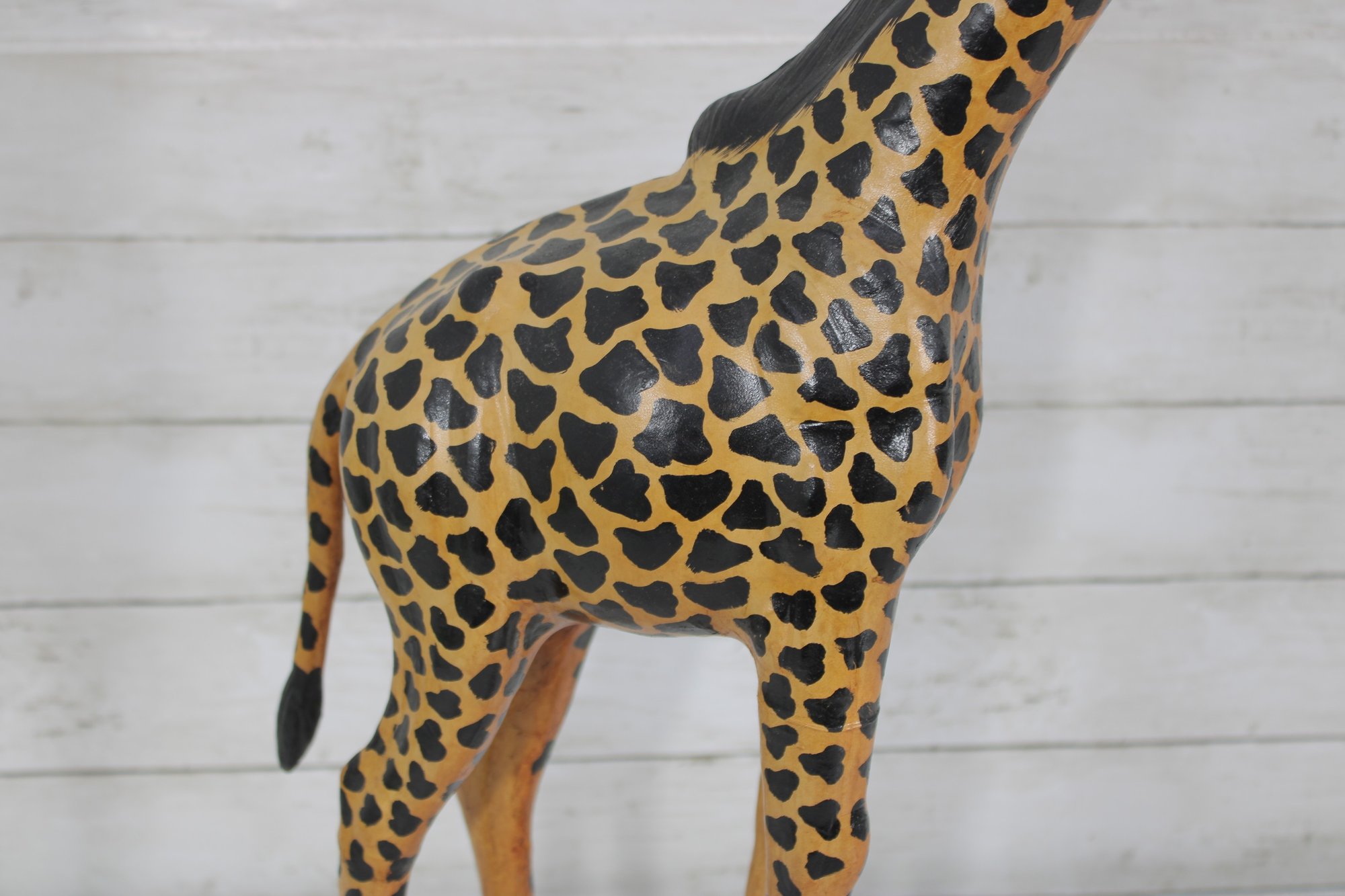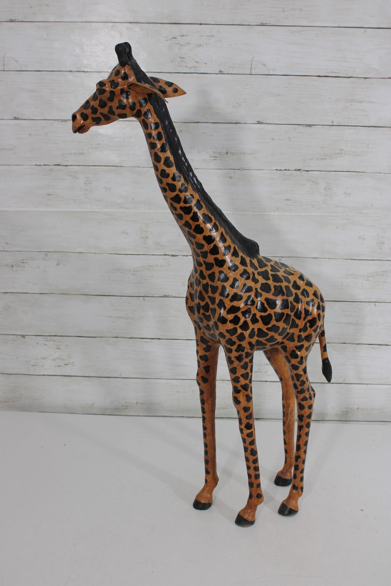The giraffe is finished in warm golden tones with dark, hand-painted spots and black detailing along the mane and horns. The slightly stylized carving and visible brushwork give it an artisan, folk art feel rather than a mass-produced look. Its upright posture and slender legs make it a perfect vertical accent without overwhelming a room.