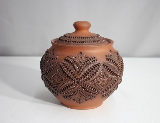 This unique lidded pot is a stunning example of traditional Lviv ceramic craftsmanship. Hand-thrown and intricately decorated with ornate cut-out patterns, it showcases remarkable artistry and skill. The rich terracotta finish is complemented by detailed, symmetrical designs, making it a charming addition to any collection or home decor.