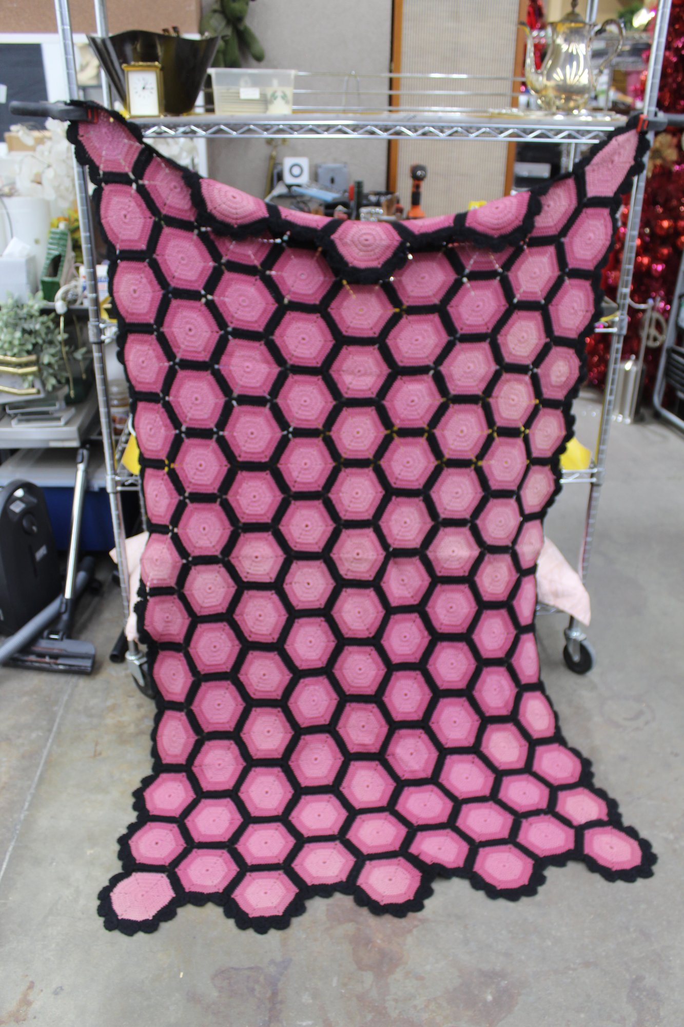 This stunning handcrafted crochet throw blanket features an intricate hexagon pattern in vibrant pink with bold black borders, creating a visually striking and unique design. The meticulous craftsmanship and cozy texture make it perfect for draping over a sofa, chair, or bed to add a pop of color and warmth to any room.