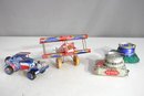 This unique set of handmade toys is crafted from upcycled tin cans, featuring: