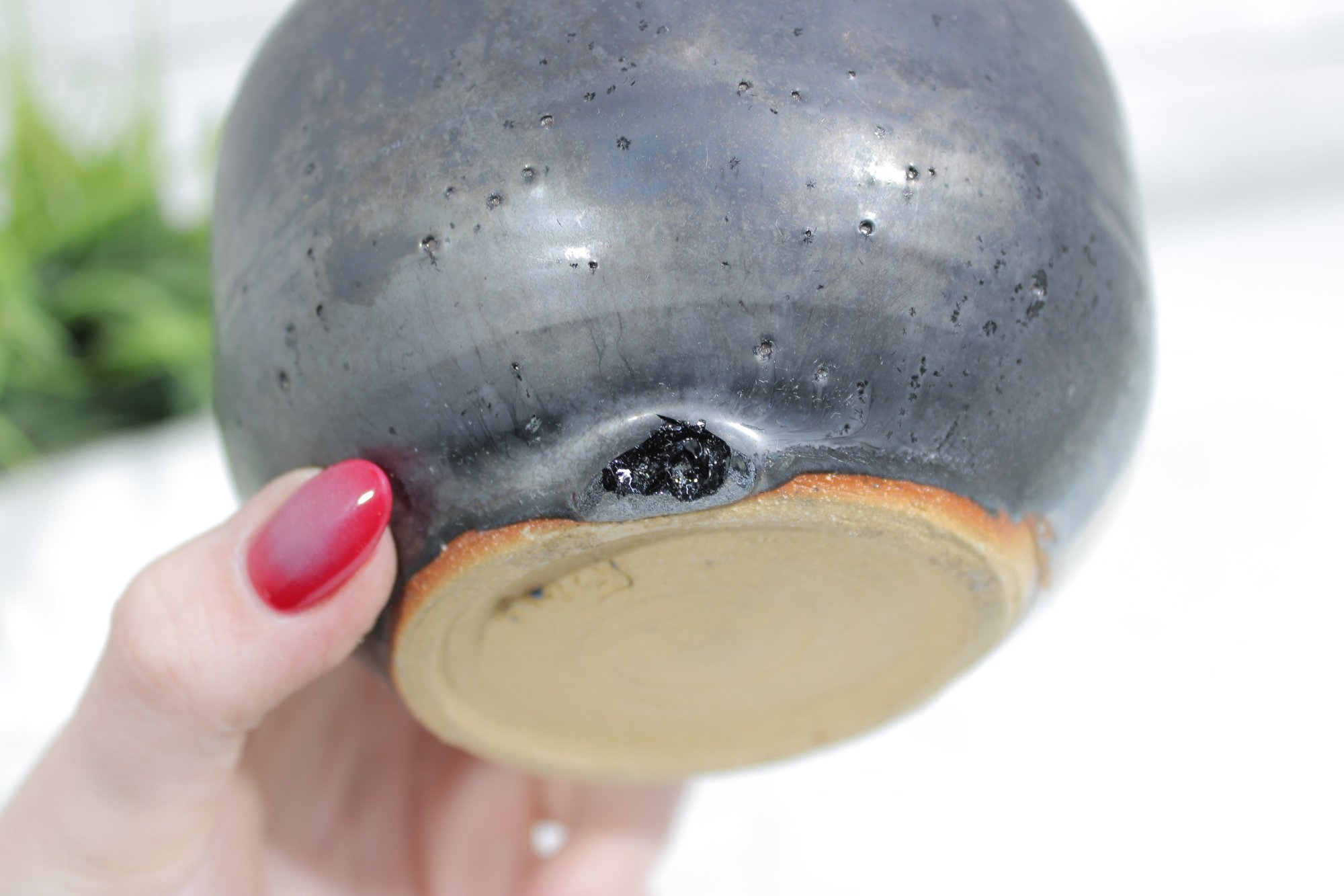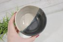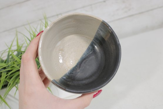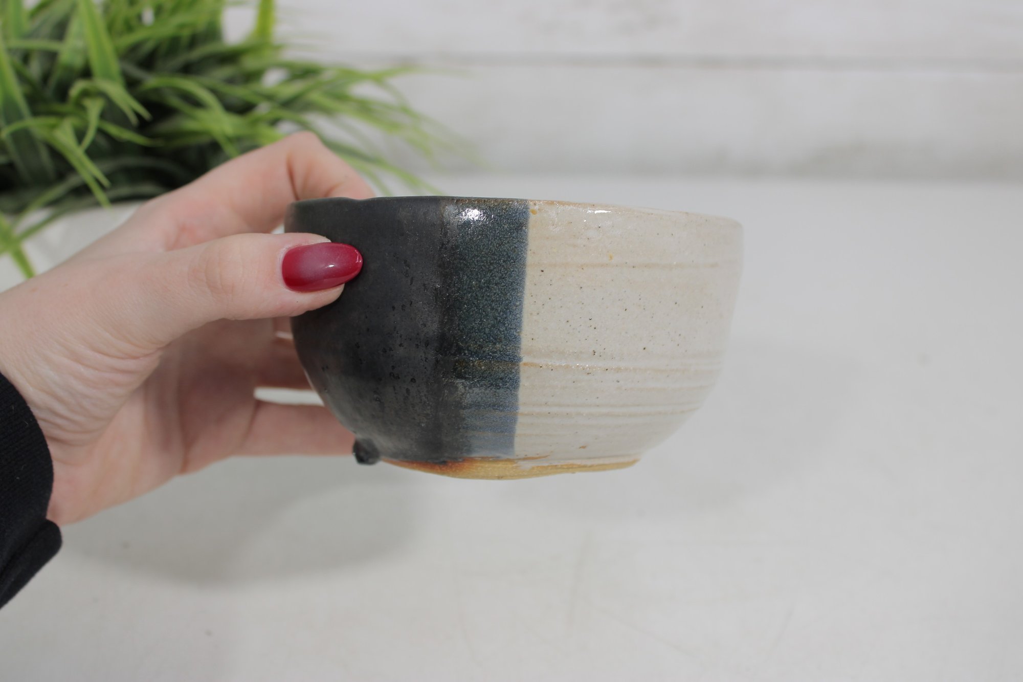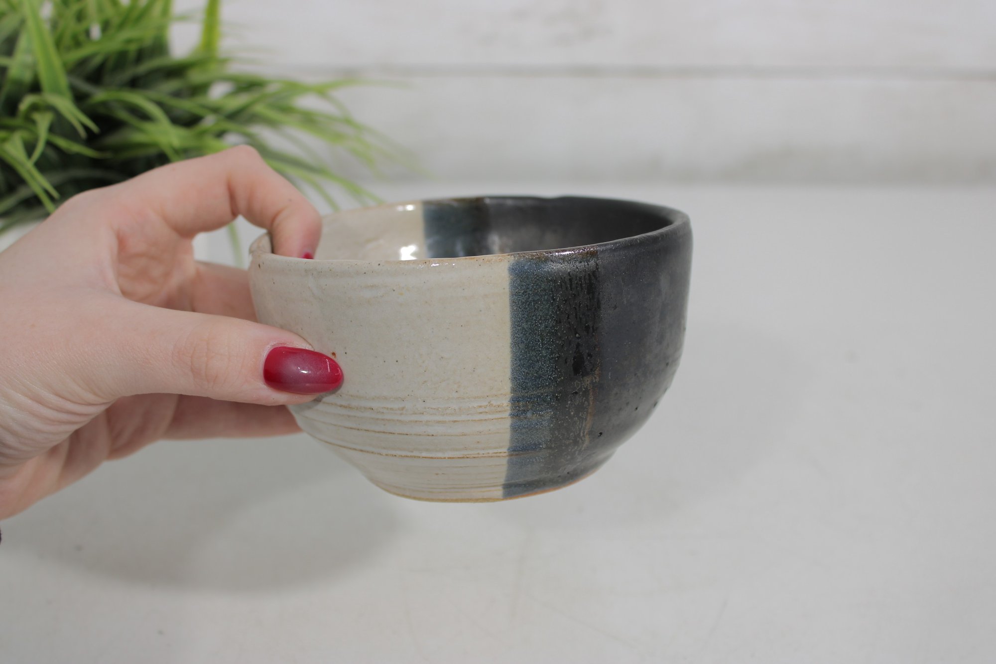 Charming handcrafted studio pottery bowl featuring a distinctive two-tone glaze design. One half displays a rich charcoal/black glaze, while the other showcases a soft natural beige with subtle speckling, creating a contrast that highlights its artisan character.