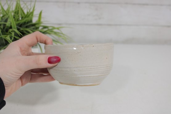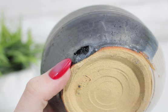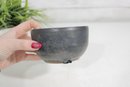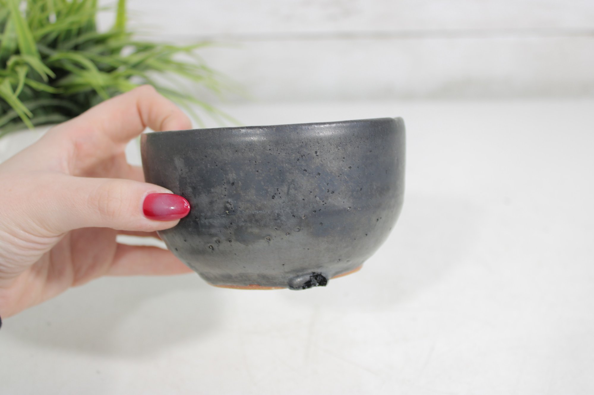 The bowl has a nicely balanced, rounded form with small tripod-style feet, adding both stability and a unique sculptural element. The unglazed base reveals natural clay tones, further emphasizing its handmade quality.