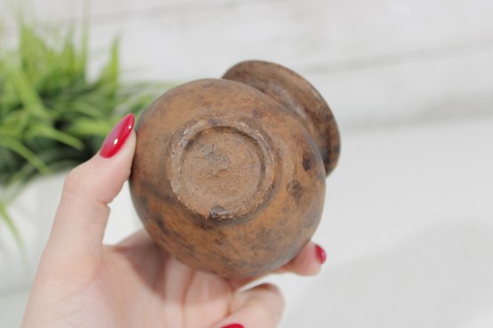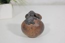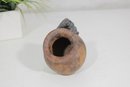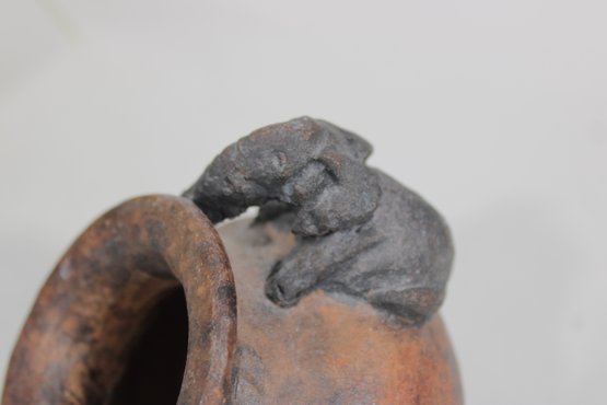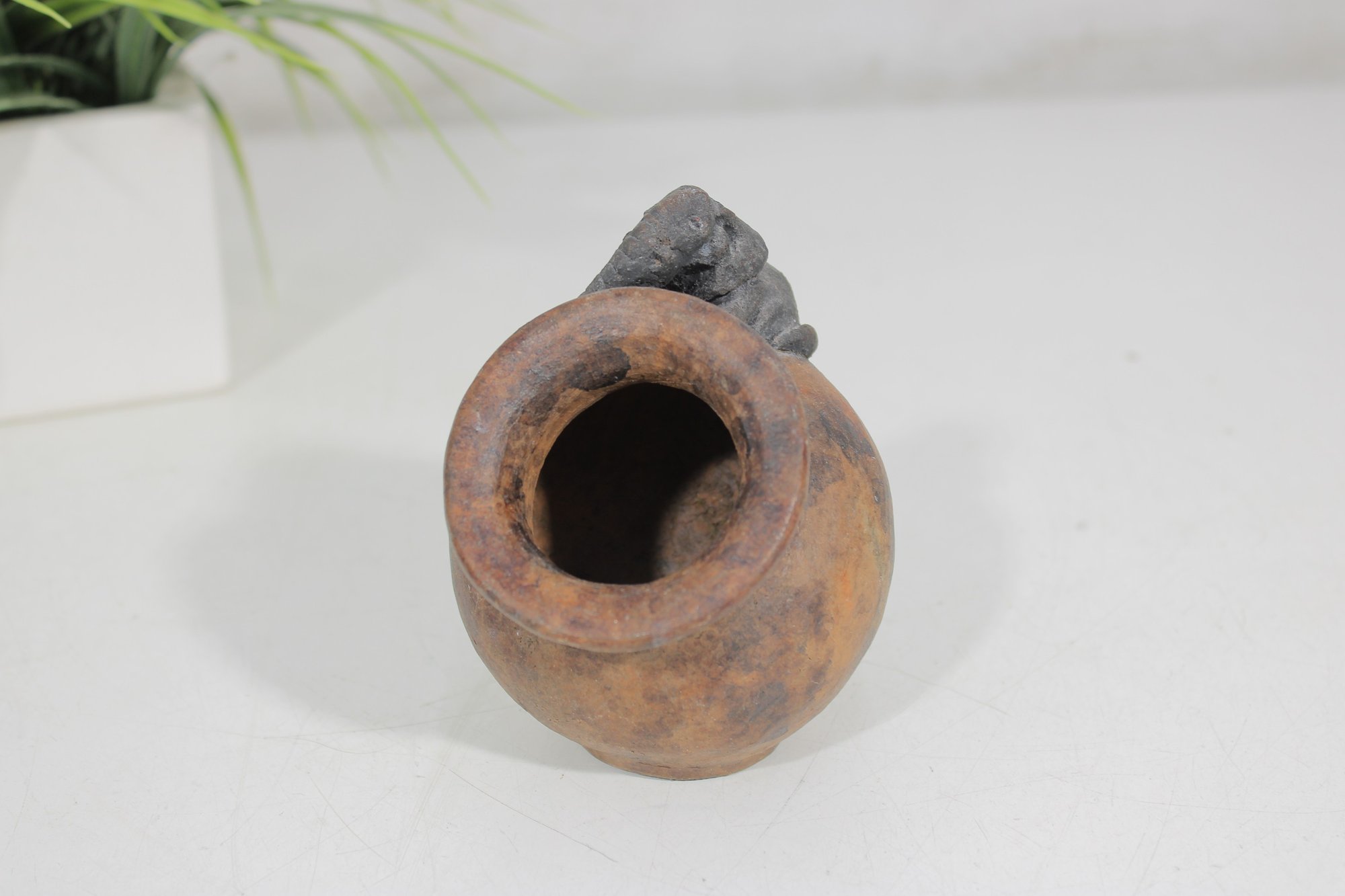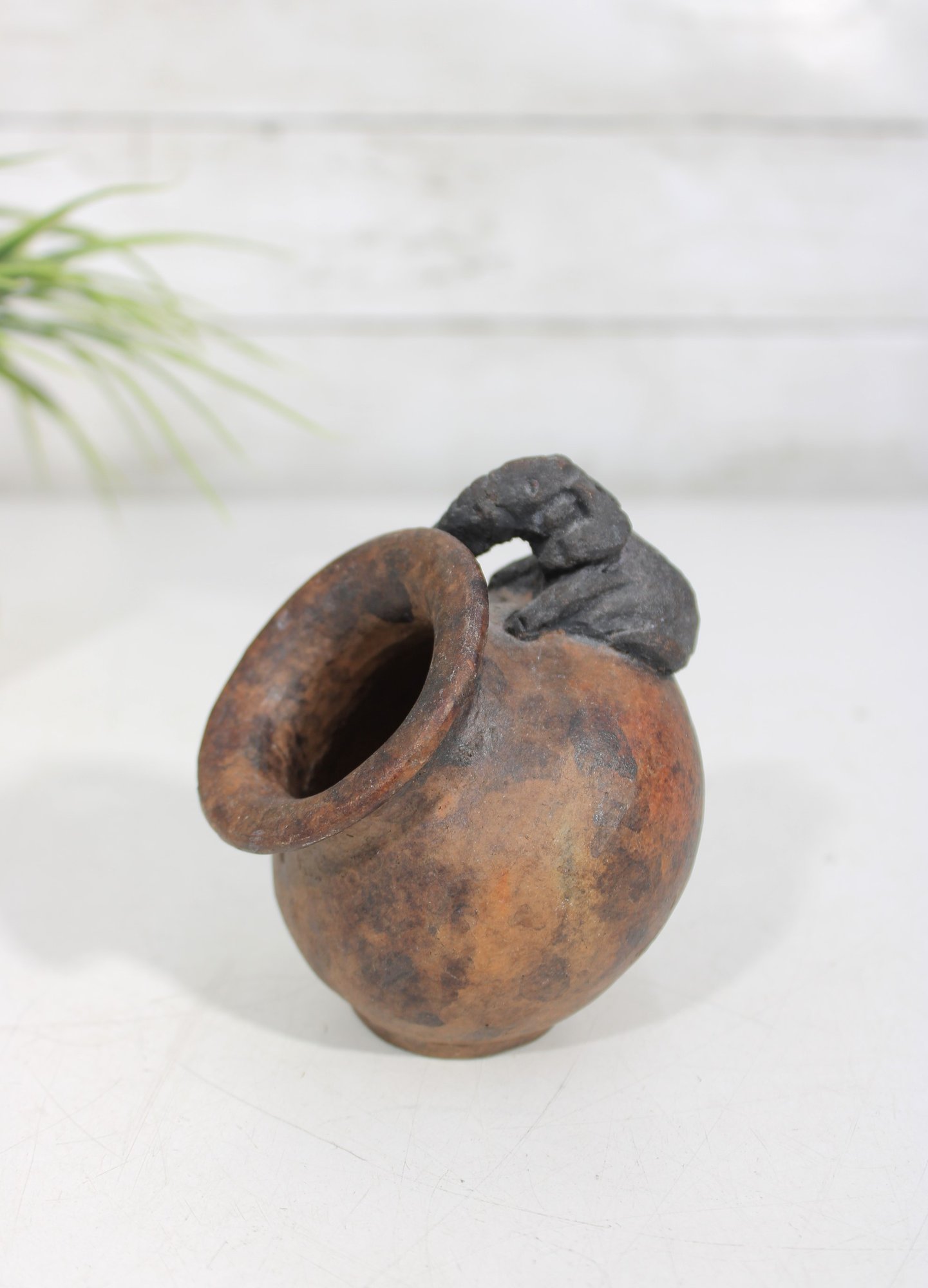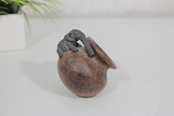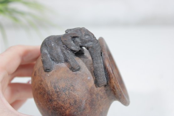his unique handcrafted studio pottery vase features a charming sculptural detail of an elephant draped over the rim, making it a standout decorative piece. Measuring approximately 4 inches tall, the vase has a rounded, slightly tilted form with a wide mouth and a beautifully textured, earthy finish.