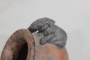 The surface displays warm brown and terracotta tones with natural variations that enhance its rustic, organic appeal. The hand-applied elephant figure adds character and artistic interest, giving the piece a whimsical yet earthy presence.