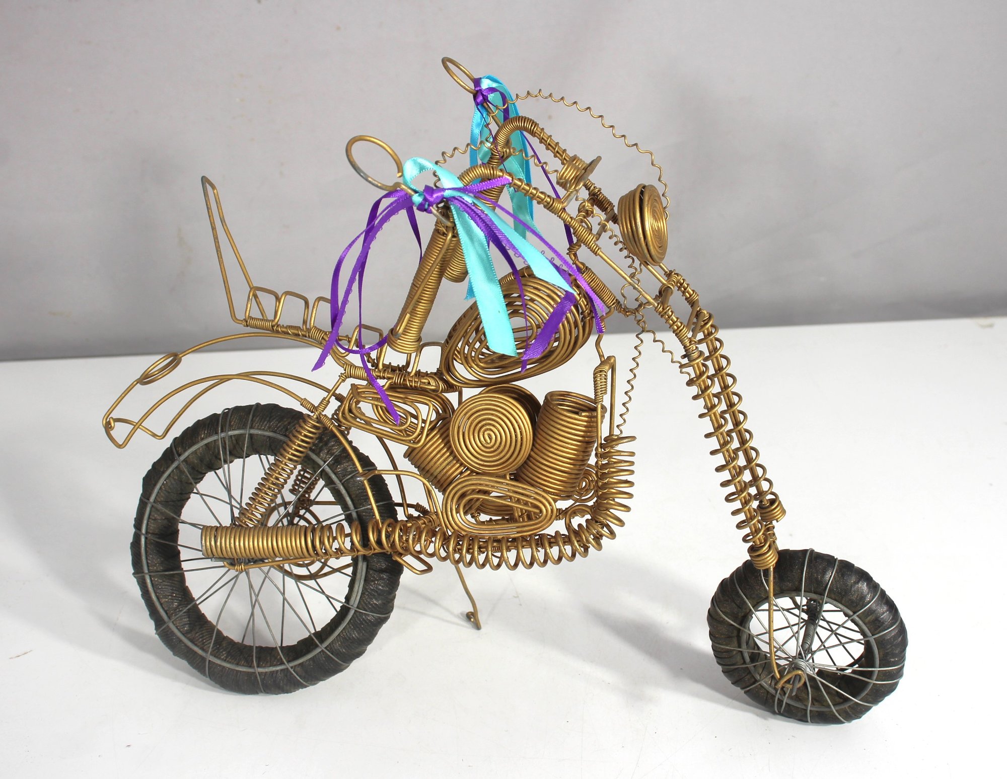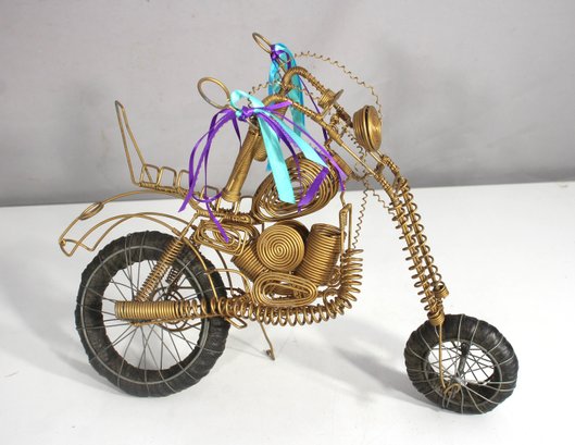 This handmade wire motorcycle sculpture is a bold and playful piece of folk art, constructed from twisted and coiled metal wire with coiled and looped details throughout. Measuring 11 inches high by 14 inches wide, it showcases an impressively detailed chopper-style design, complete with handlebar streamers and sculptural accents mimicking an engine, tires, and frame.