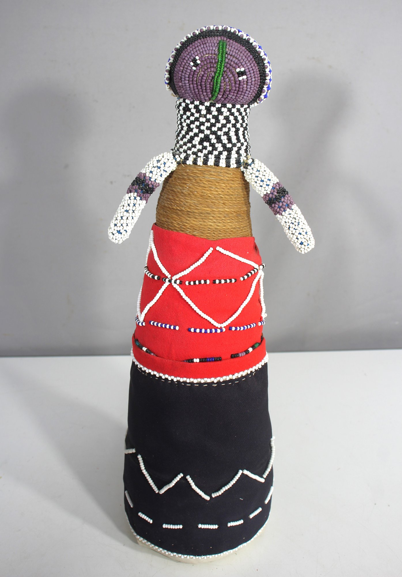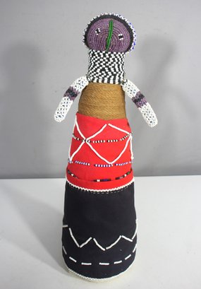 This beautiful 18” handmade African Ndebele beaded doll is a stunning example of traditional craftsmanship, featuring intricate beadwork, wrapped thread, and fabric detailing. These dolls are deeply rooted in Ndebele culture, often used for ceremonial and decorative purposes.