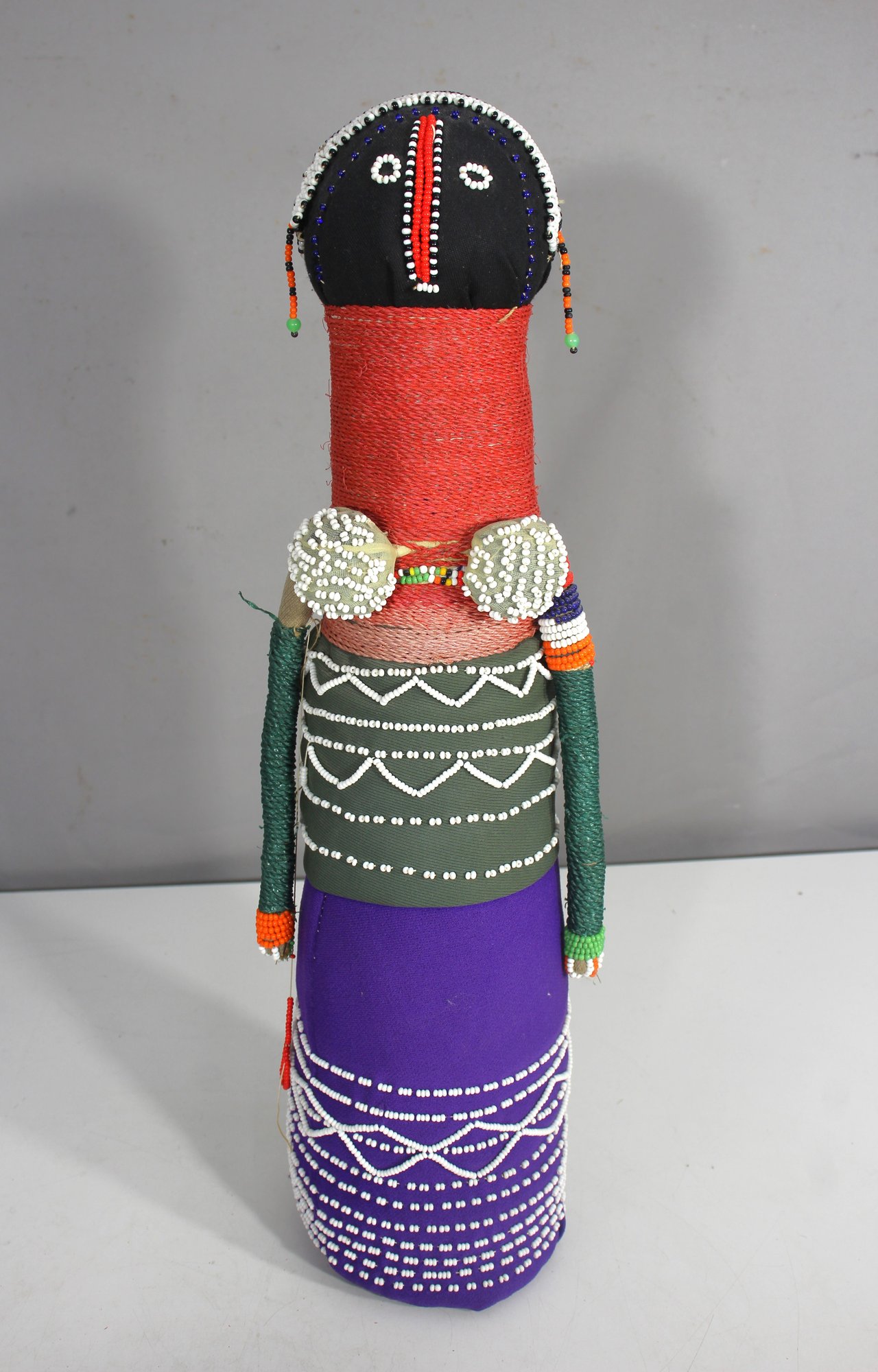 a stunning handmade African Ndebele fertility doll, an authentic representation of traditional South African tribal artistry. This beautifully crafted piece is adorned with intricate beadwork, fabric, and wrapped yarn, symbolizing fertility, protection, and cultural heritage.