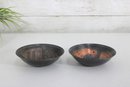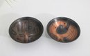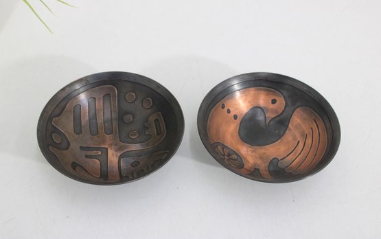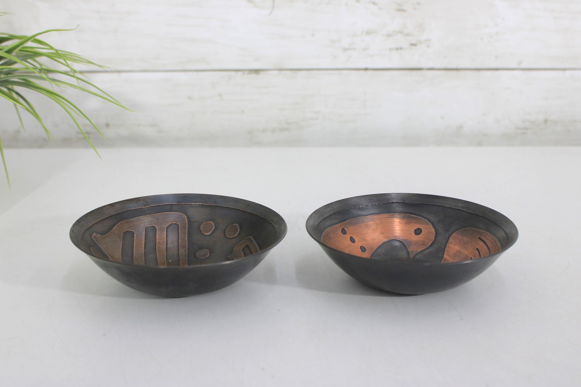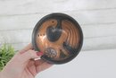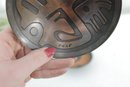 Beautiful handmade copper plate featuring a stylized Mayan-inspired design with rich warm tones and darkened etched detailing. This small 5" round decorative dish showcases traditional tribal motifs with a striking contrast between polished copper and oxidized accents.