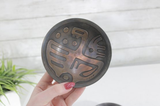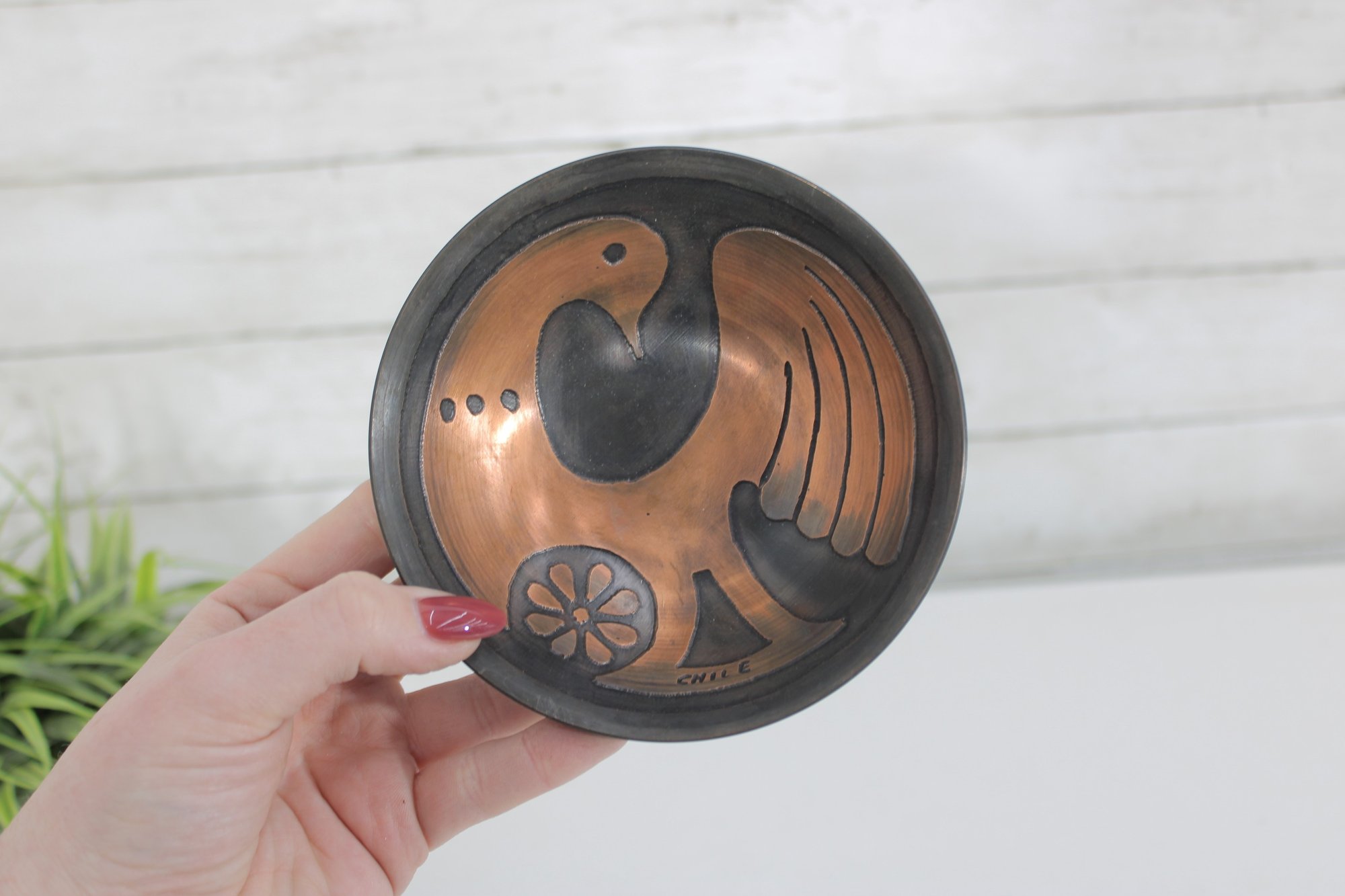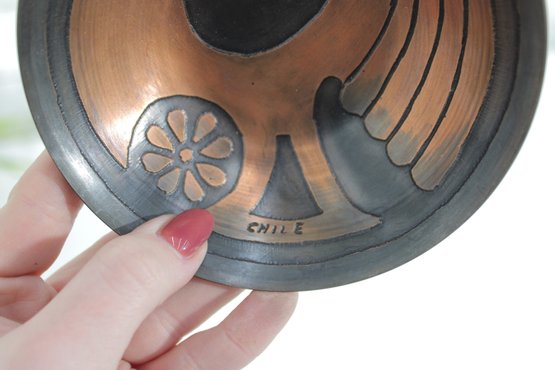 Stamped “Chile” on the front, this piece reflects South American metalwork craftsmanship and makes a wonderful decorative accent for collectors of Latin American art, tribal décor, or handcrafted copper pieces.