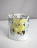 This unique handmade studio pottery vase features a pierced openwork floral design with expressive hand-painted details. Standing 5.5 inches tall, the piece showcases sculptural cutouts and raised yellow flower motifs accented by light green and lavender foliage. The white glaze base is lightly speckled and trimmed in earthy browns for a rustic yet whimsical appearance.