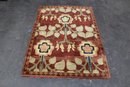 This exquisite 68" x 48.5" handwoven area rug features a striking Arts and Crafts-inspired design with bold floral motifs. The deep red background is complemented by green, gold, and blue accents, creating a vibrant yet sophisticated piece of decor.