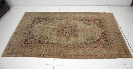 Traditional Persian floral and vine motifs with a central medallion, bordered by intricate patterns.Soft tones of beige, brown, and muted reds, with subtle green and gold accents.