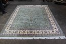 This stunning handwoven Persian-style area rug, measuring 119" x 97", features an intricate floral motif in a sophisticated green color palette, bordered with cream, blue, and earthy tones. The rug is a true testament to craftsmanship, showcasing meticulous detailing and vibrant patterns that reflect timeless artistry.