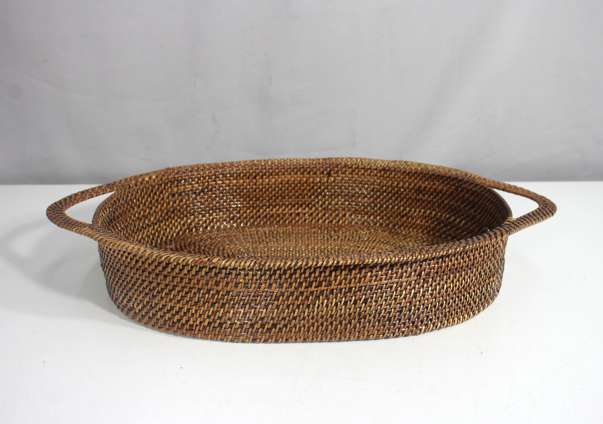 This beautiful handwoven rattan serving tray features a natural woven pattern and convenient side handles for easy carrying. Measuring 18” wide, 12” deep, and 3” high, this oval-shaped tray is perfect for serving, organizing, or decorative use in any space.