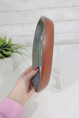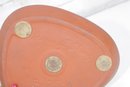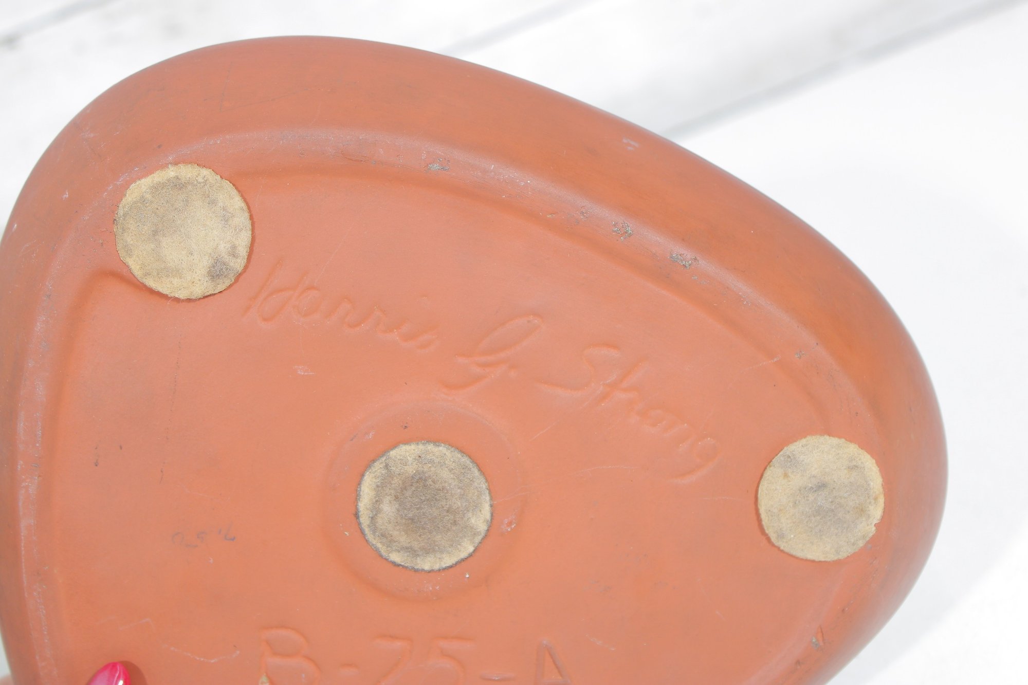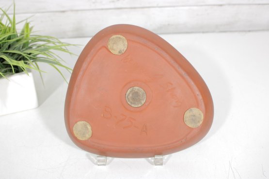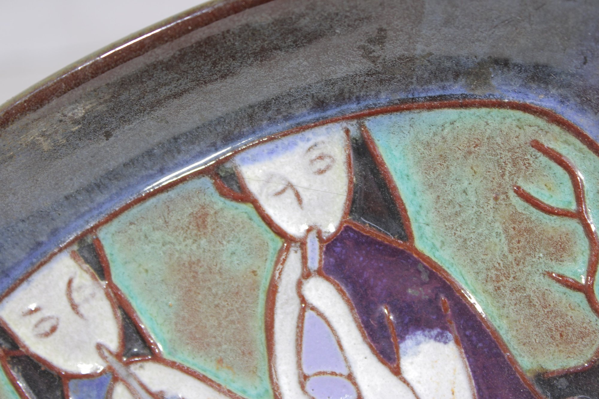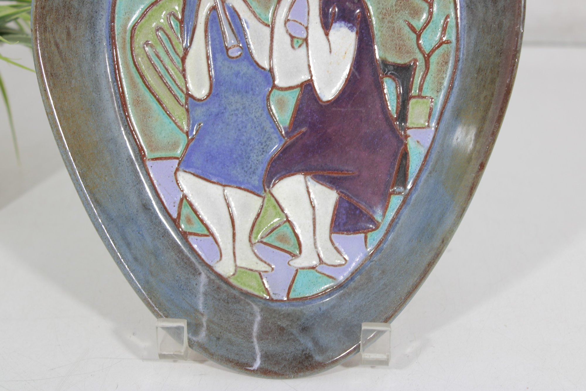 The plaque has an organic triangular form with a wide border in a muted glaze, framing the central figural motif. The figures are depicted in a graceful, modernist style, typical of Harris G. Strong’s decorative work.