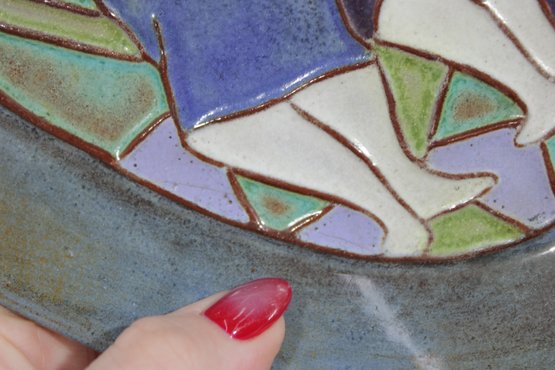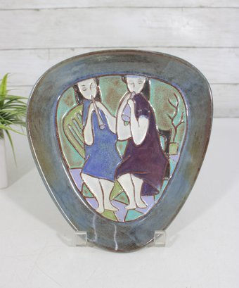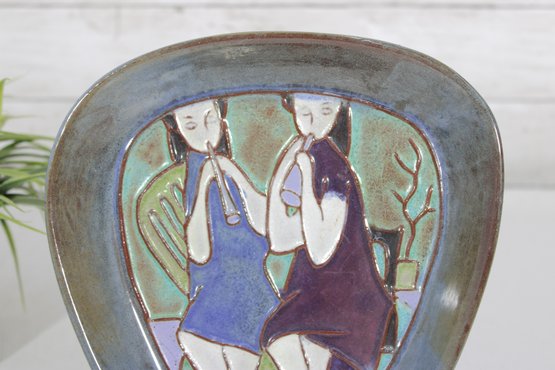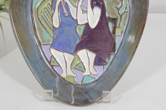 art pottery wall plaque by Harris G. Strong, known for his distinctive mid-century ceramic designs. This piece features a stylized figural scene of two dancing figures, rendered in a soft, artistic palette of blues, greens, and earthy tones with raised, textured detailing.