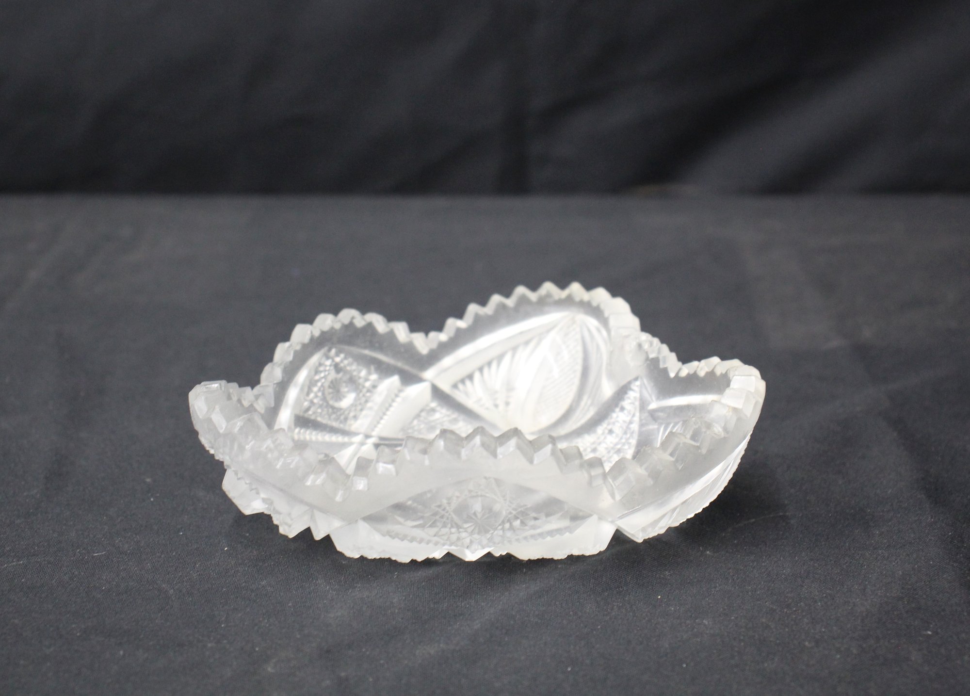 classic glasswork with a touch of romance. This exquisitely detailed dish features a plethora of cut patterns, including diamond points, fans, and flutes, which collectively capture and reflect light to create a sparkling display on any table.