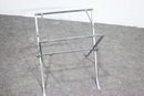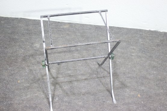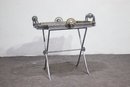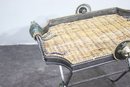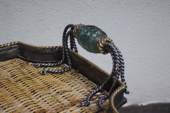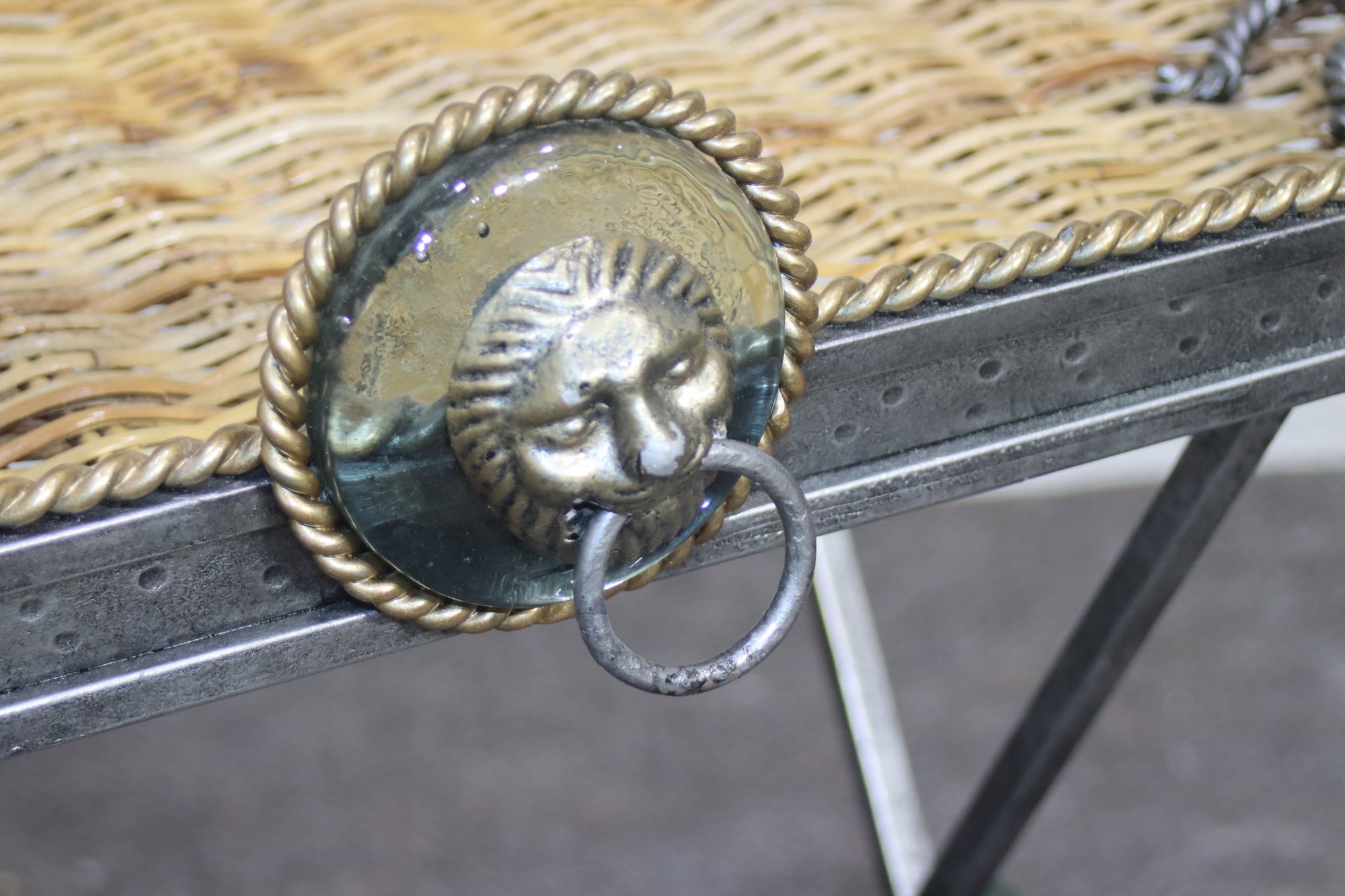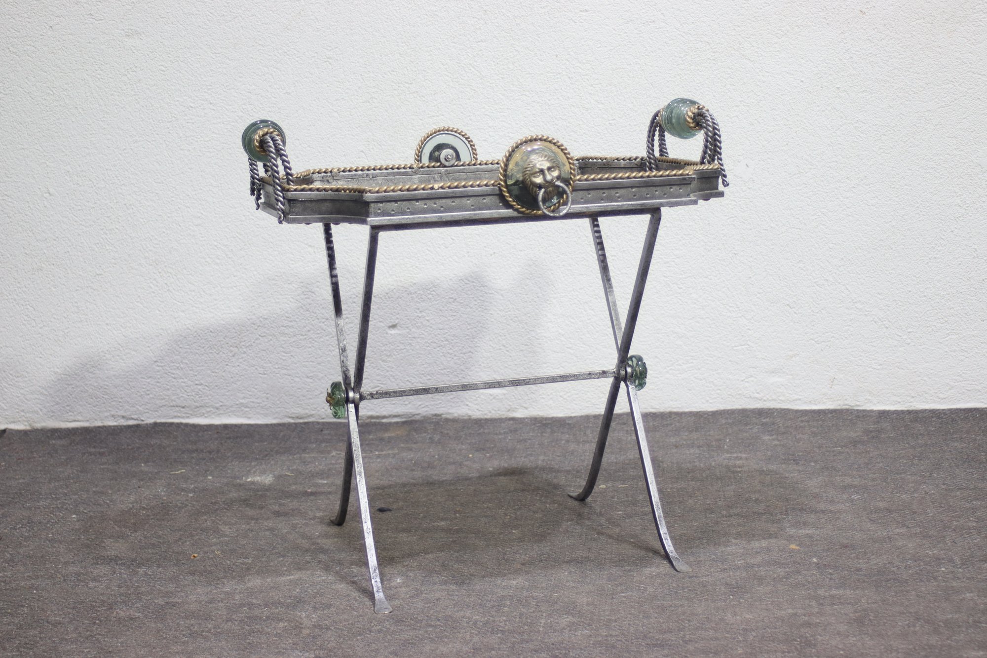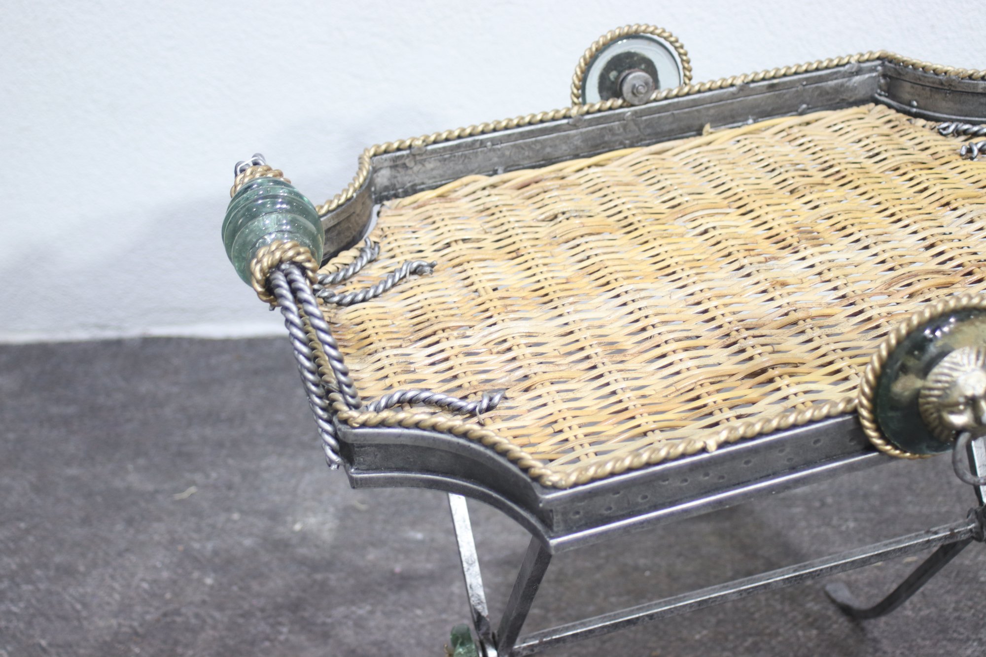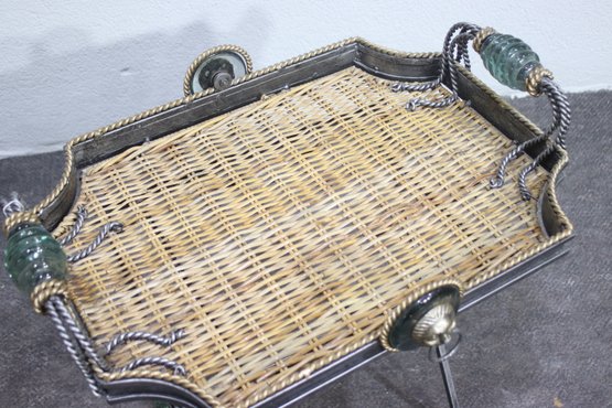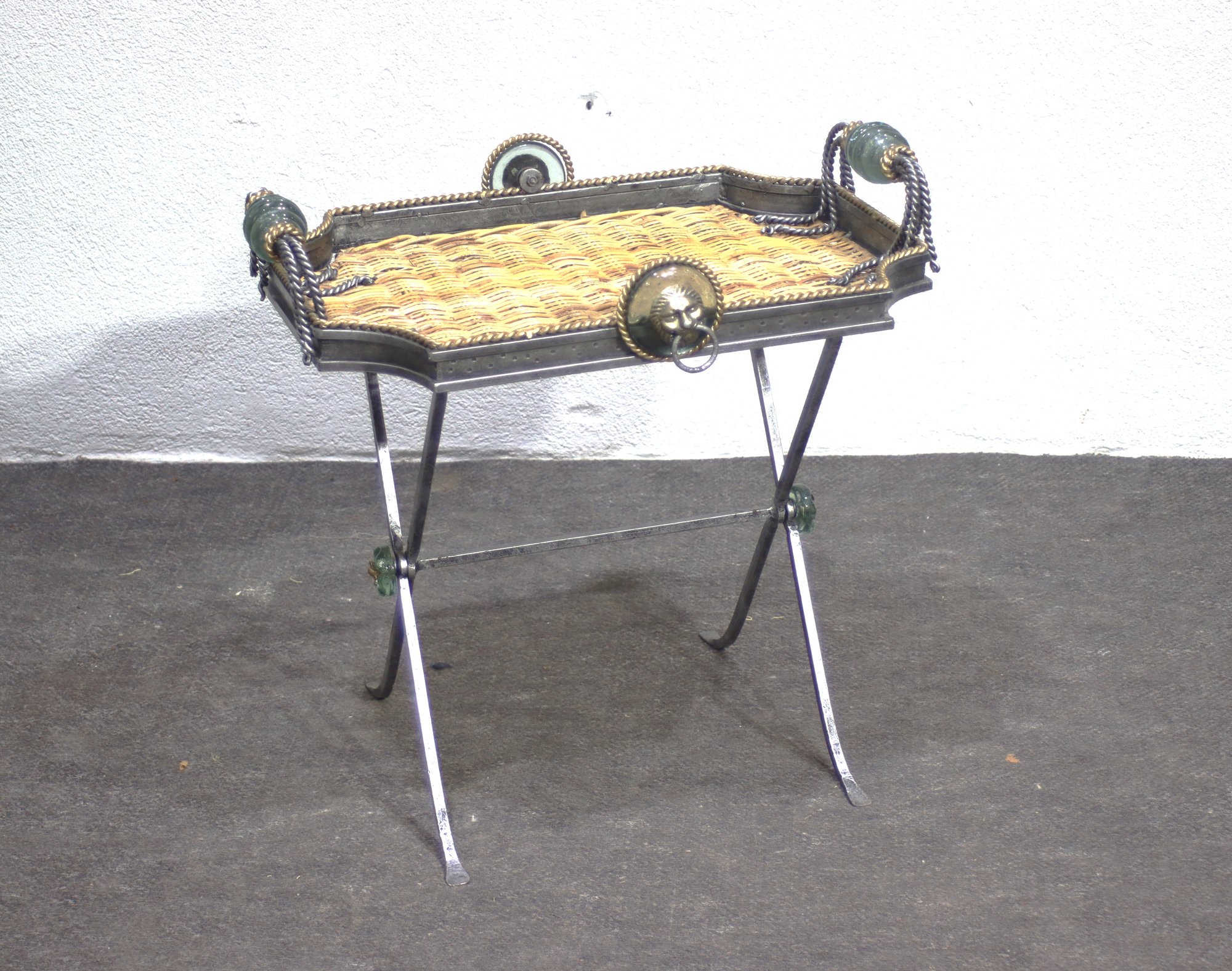 This heavy and ornate metal and glass folding tray table is a stunning decorative and functional piece, featuring wrought iron, woven wicker, and intricate lion head accents. The table's tray-style top has twisted metal detailing, green glass embellishments, and rope-like metal handles, giving it a regal and antique-inspired appearance.