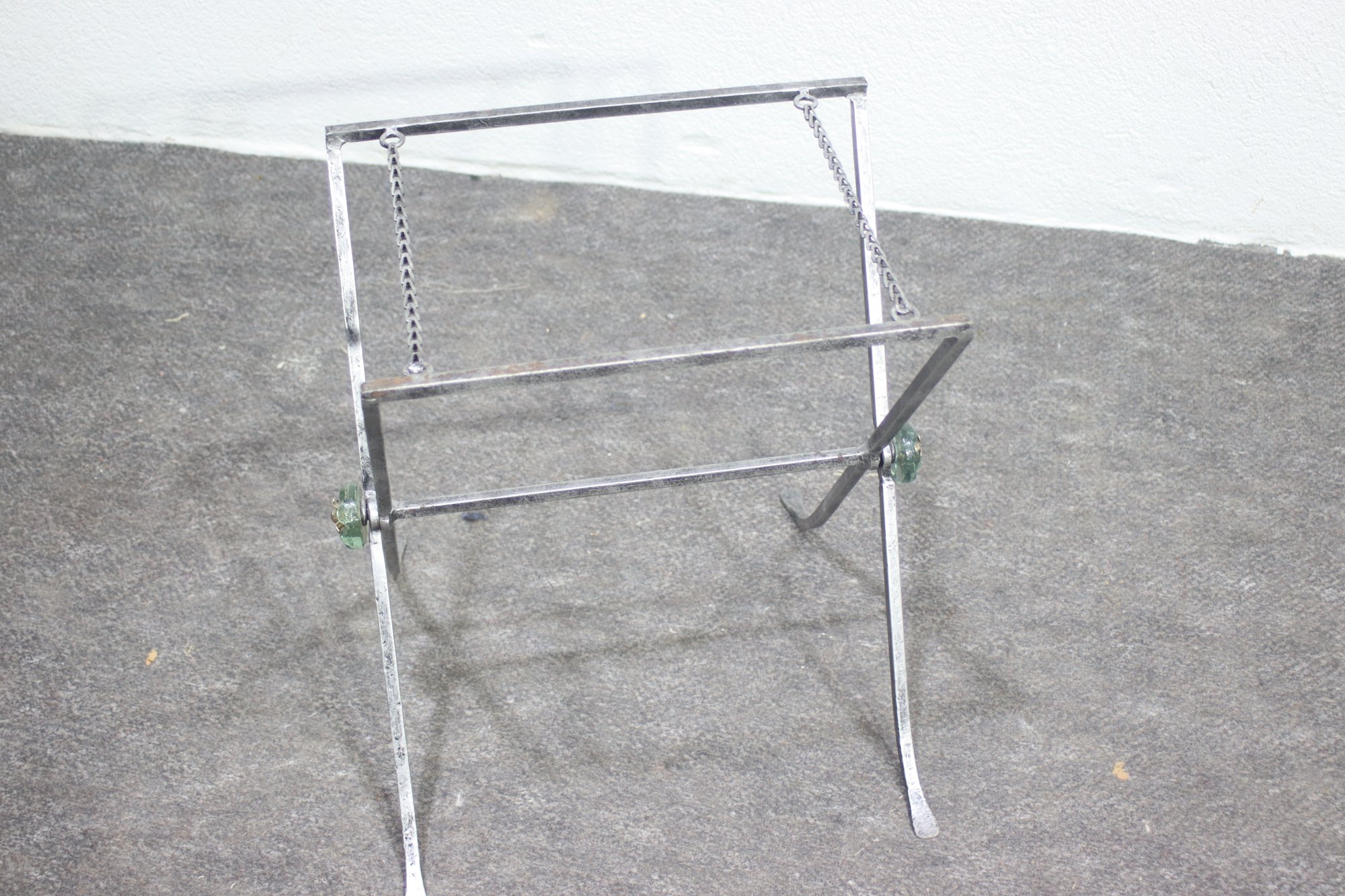 Lion head metal ring pulls, twisted iron accents, and green glass elements
