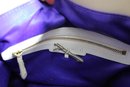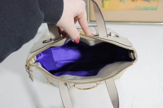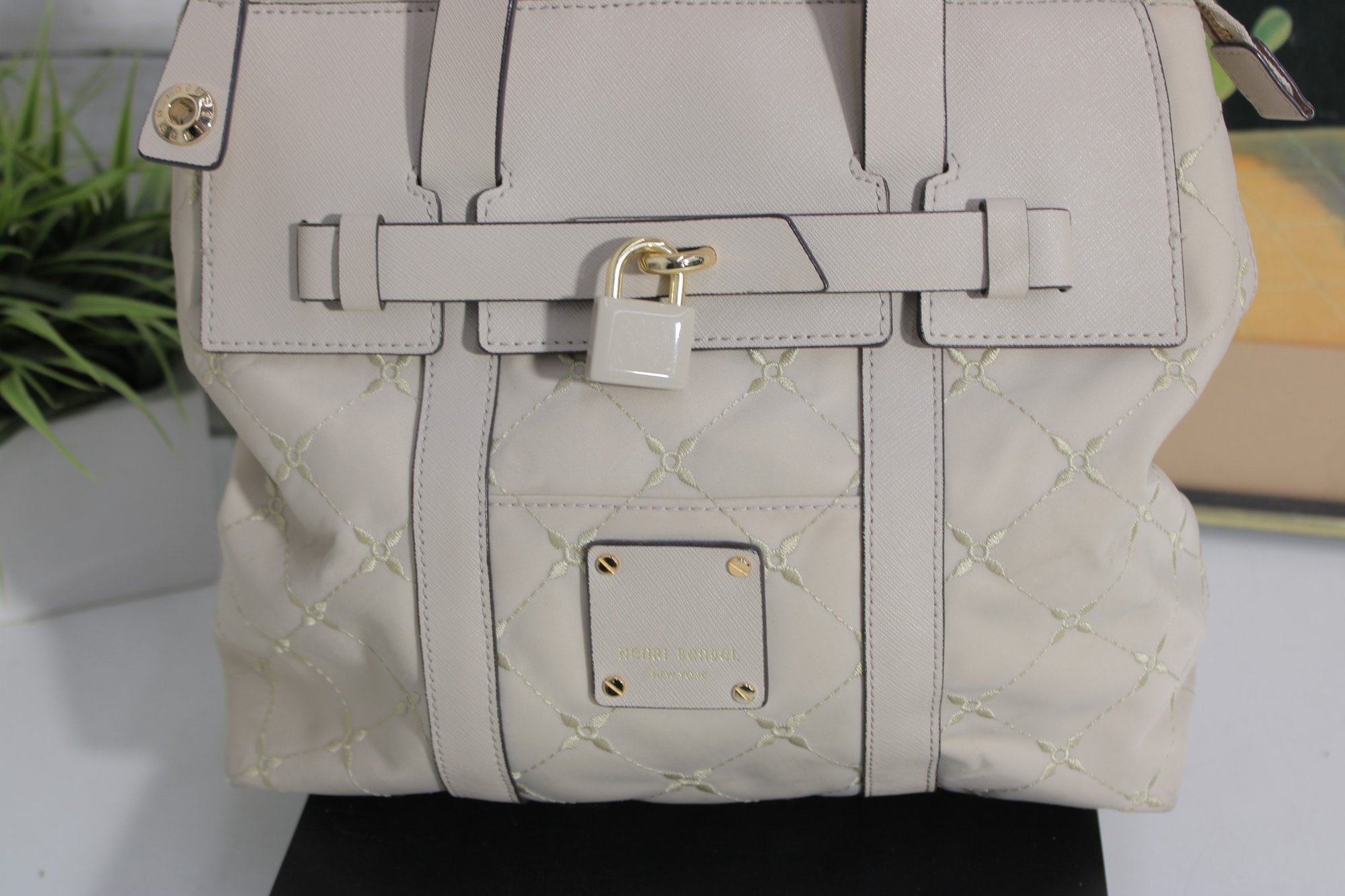 The structured silhouette features a belted front with lock detail, dual top handles, and a full zip top opening. Inside is the iconic Henri Bendel purple-lined interior with generous space for daily essentials, travel items, or work necessities.