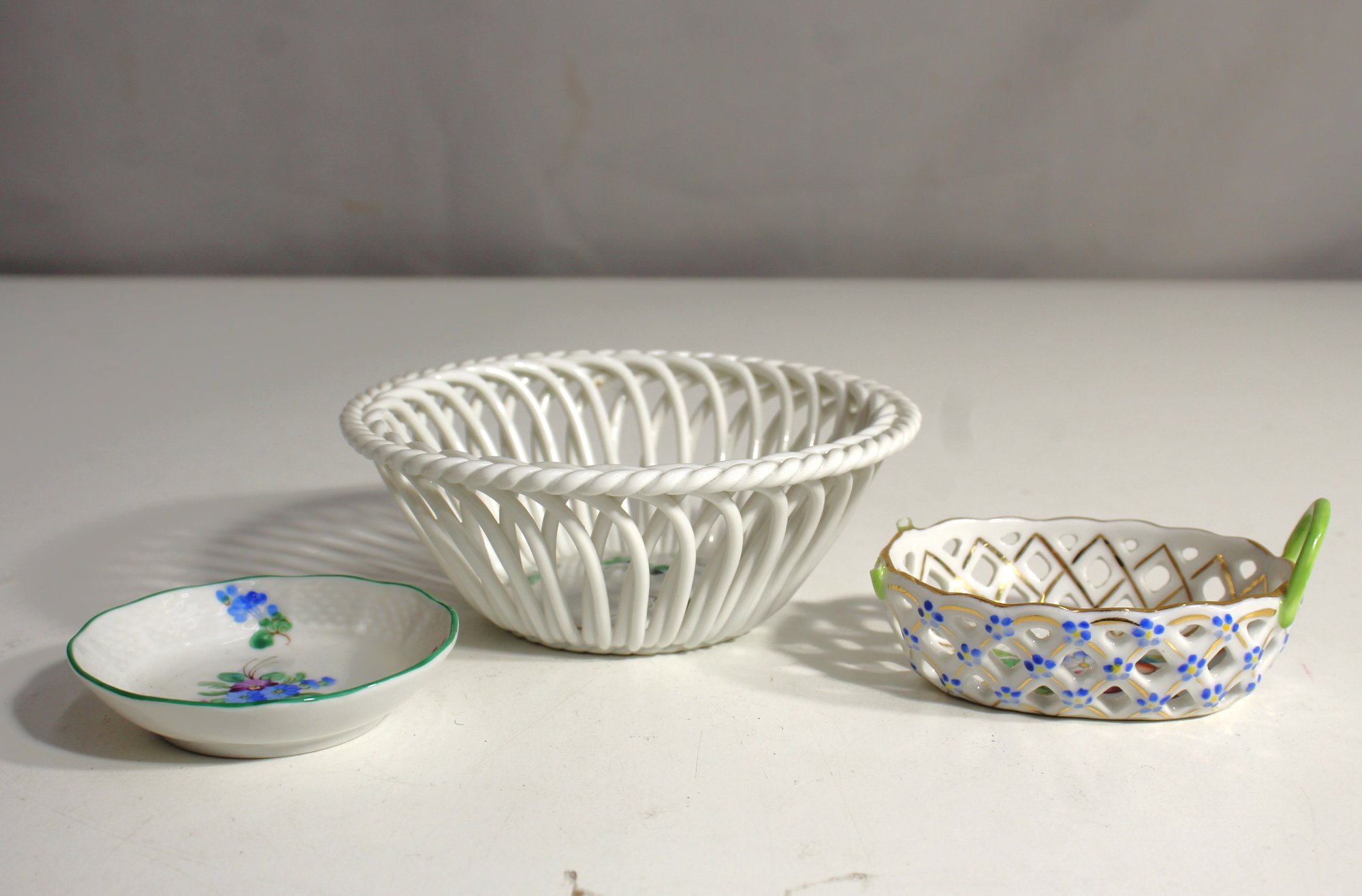 This charming lot features a collection of delicate porcelain pieces, including a Herend miniature basket, a floral bowl, and a lattice-style dish. The Herend basket showcases its signature intricate lattice design, though one handle is broken (as pictured). The floral bowl and lattice dish complement the set with their detailed painted floral patterns. Each piece carries the Herend hallmark. Perfect for collectors or display, with a minor flaw noted in the Herend basket.