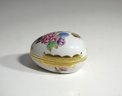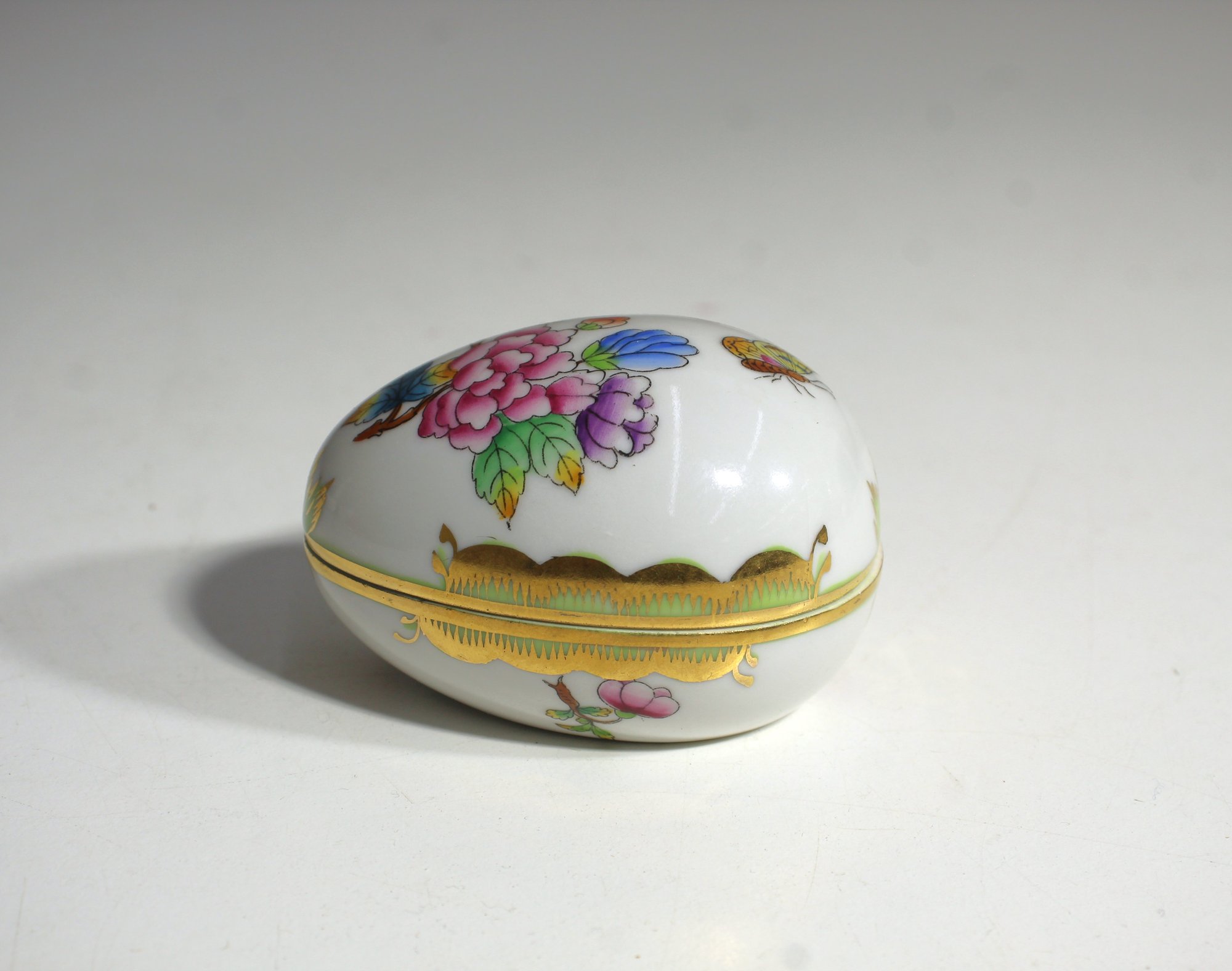 This exquisite Herend porcelain trinket box, in the shape of an egg, is beautifully adorned with a delicate hand-painted floral design. Featuring vibrant blooms and detailed gold accents, this piece showcases Herend's renowned craftsmanship. The hinged box opens to reveal a pristine white interior, perfect for small treasures or as a decorative collectible. The base is marked with the iconic Herend stamp,