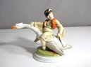 A charming and whimsical Herend porcelain figurine featuring a young boy riding a goose. The piece is beautifully detailed, showcasing Herend's craftsmanship with vibrant hand-painted accents, including the boy's orange vest and the goose's delicate features. The figurine is marked with the blue Herend stamp on the underside, authenticating its origin from the renowned Hungarian porcelain manufacturer. This delightful collectible is perfect for porcelain enthusiasts or as a statement decorative piece.