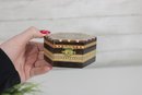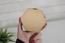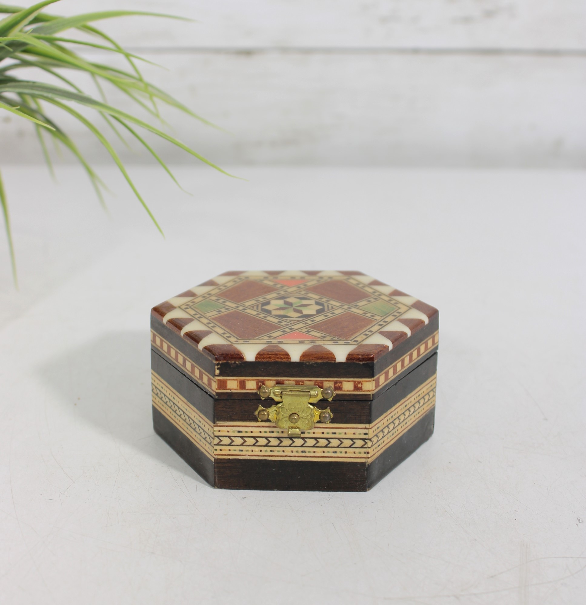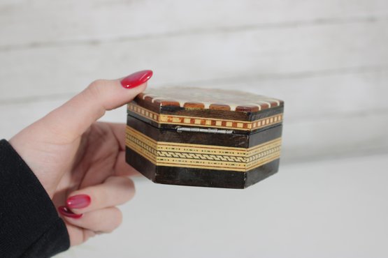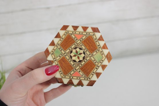 Beautiful hexagonal trinket/jewelry box featuring an intricate mosaic mirrored design. The lid showcases a geometric pattern in warm tones with fine detailing, giving the piece a distinctive, decorative appeal.