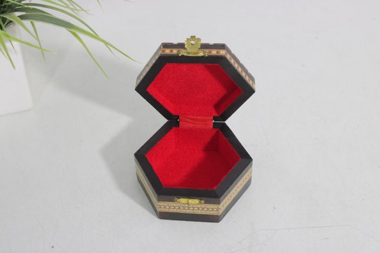The hinged lid opens to reveal a vibrant red velvet-lined interior, perfect for storing small jewelry items or keepsakes. The compact size and elegant craftsmanship make it both functional and visually striking.