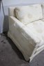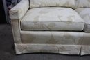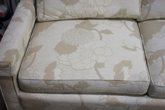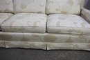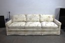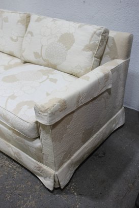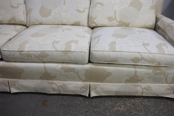 Stunning vintage Henredon 3-seater sofa featuring elegant cream floral upholstery with beige botanical accents. The timeless design includes a skirted base, square track arms, and plush, removable seat and back cushions for superior comfort.