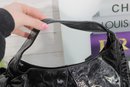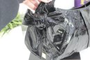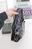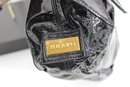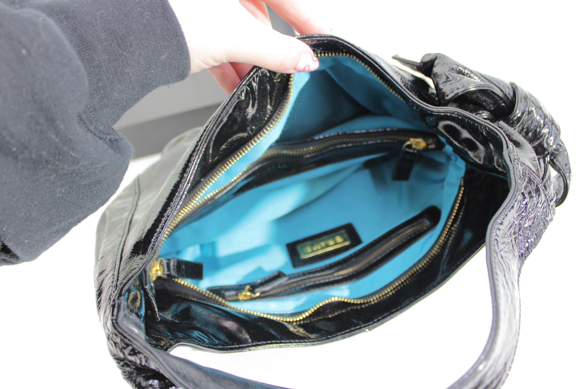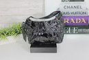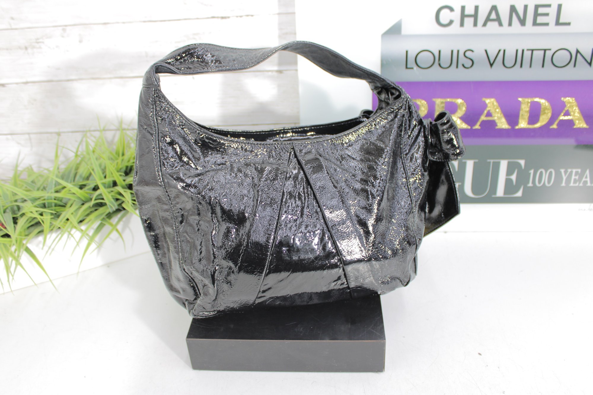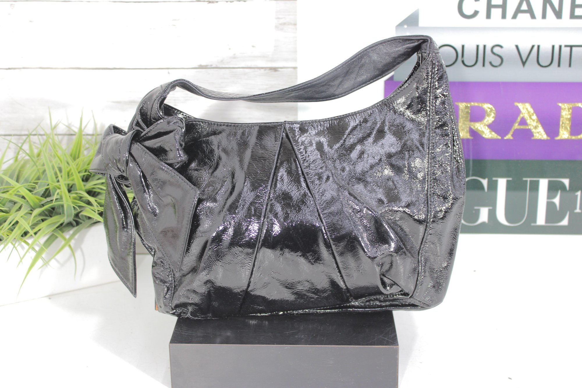 a chic Hobo International “BRAVO” black patent leather shoulder bag featuring a glossy crinkled finish and feminine bow accent detail. This stylish hobo combines edgy shine with elegant design.