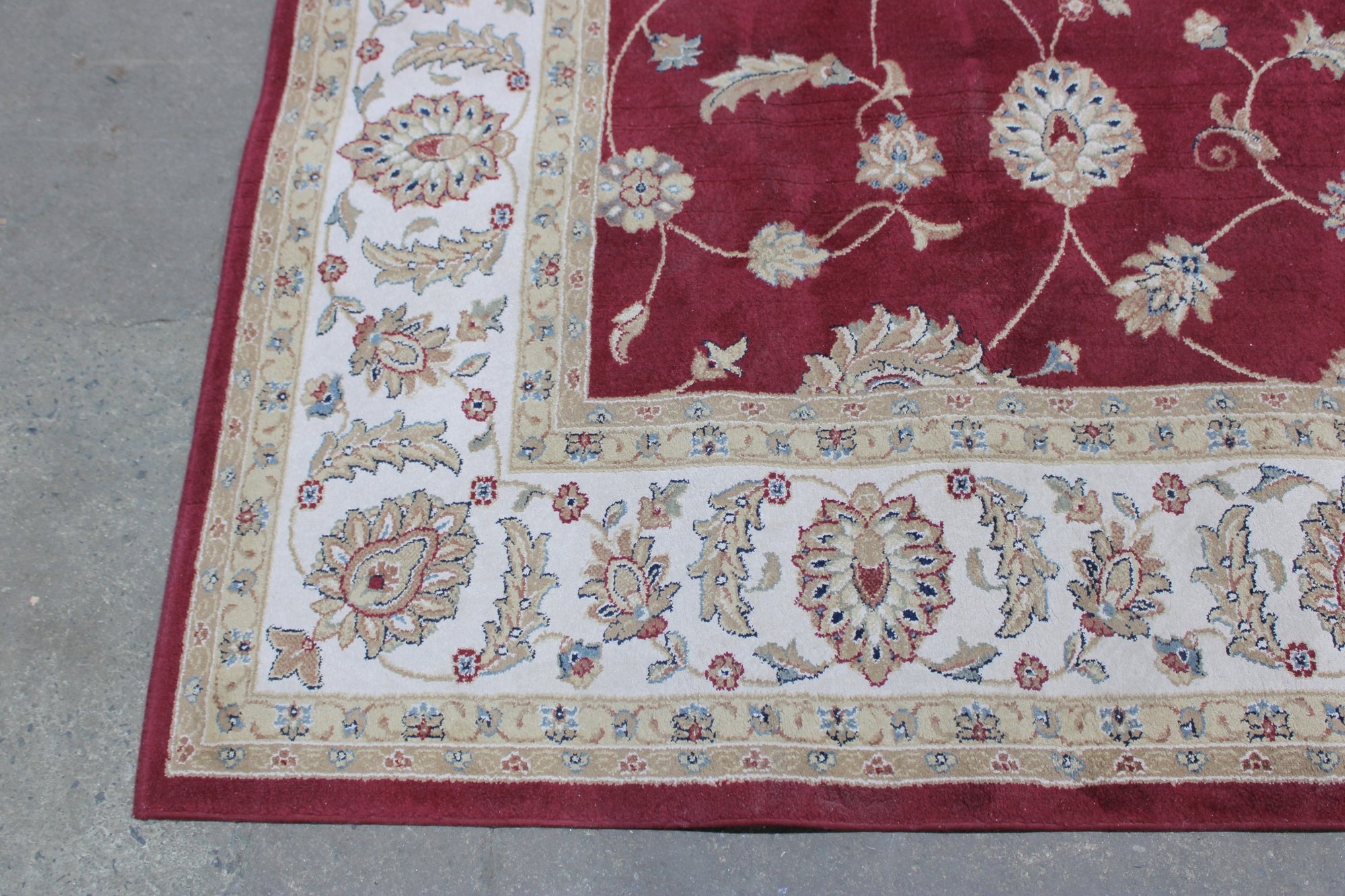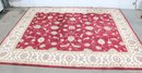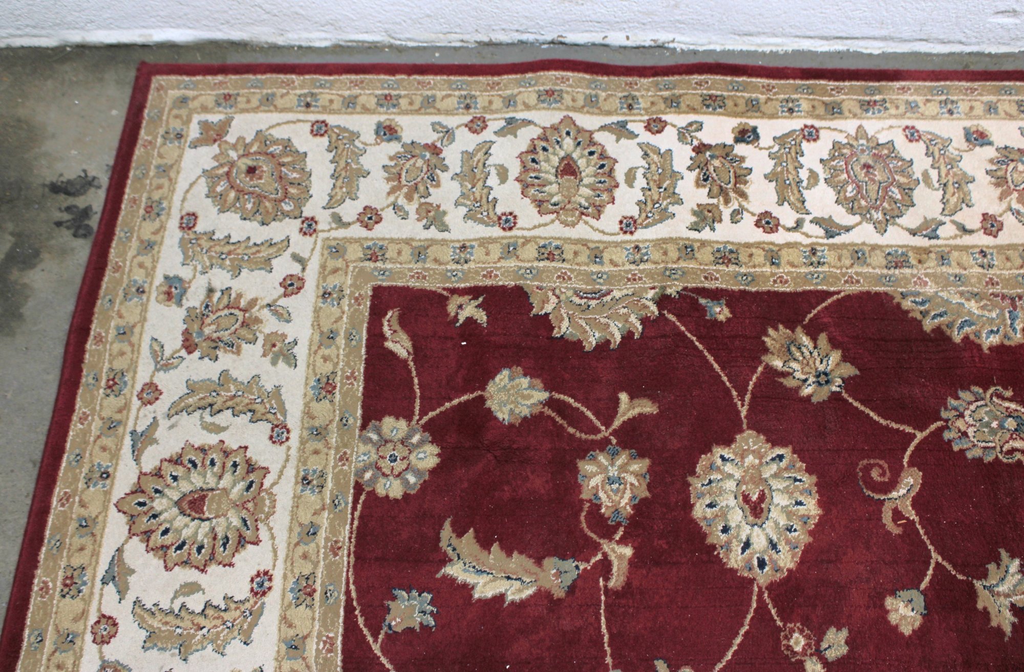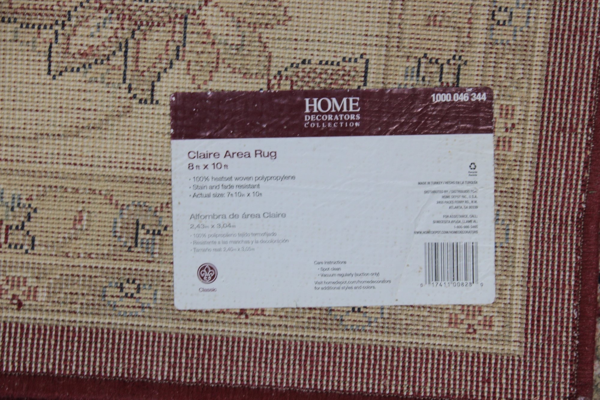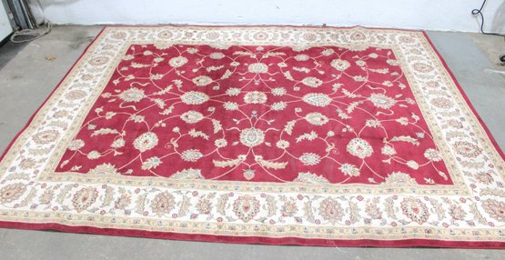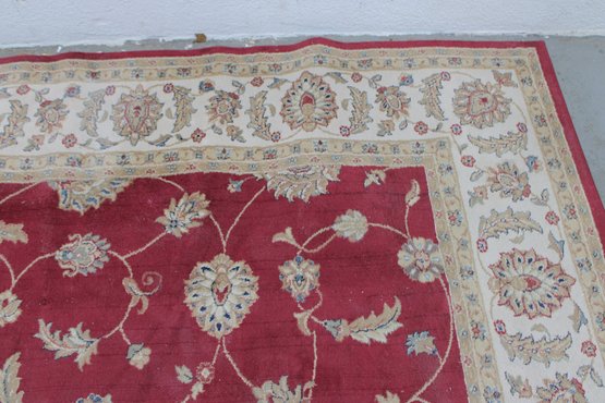 Home Decorators Collection “Claire” area rug, featuring a classic traditional floral design with rich colors and elegant detailing. The rug displays a vibrant red field with scrolling vines and floral motifs, framed by a decorative ivory border with intricate patterns.