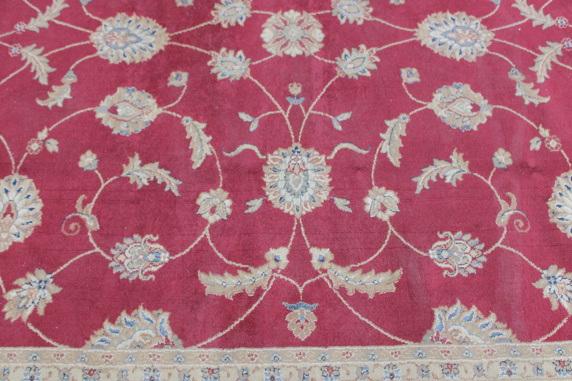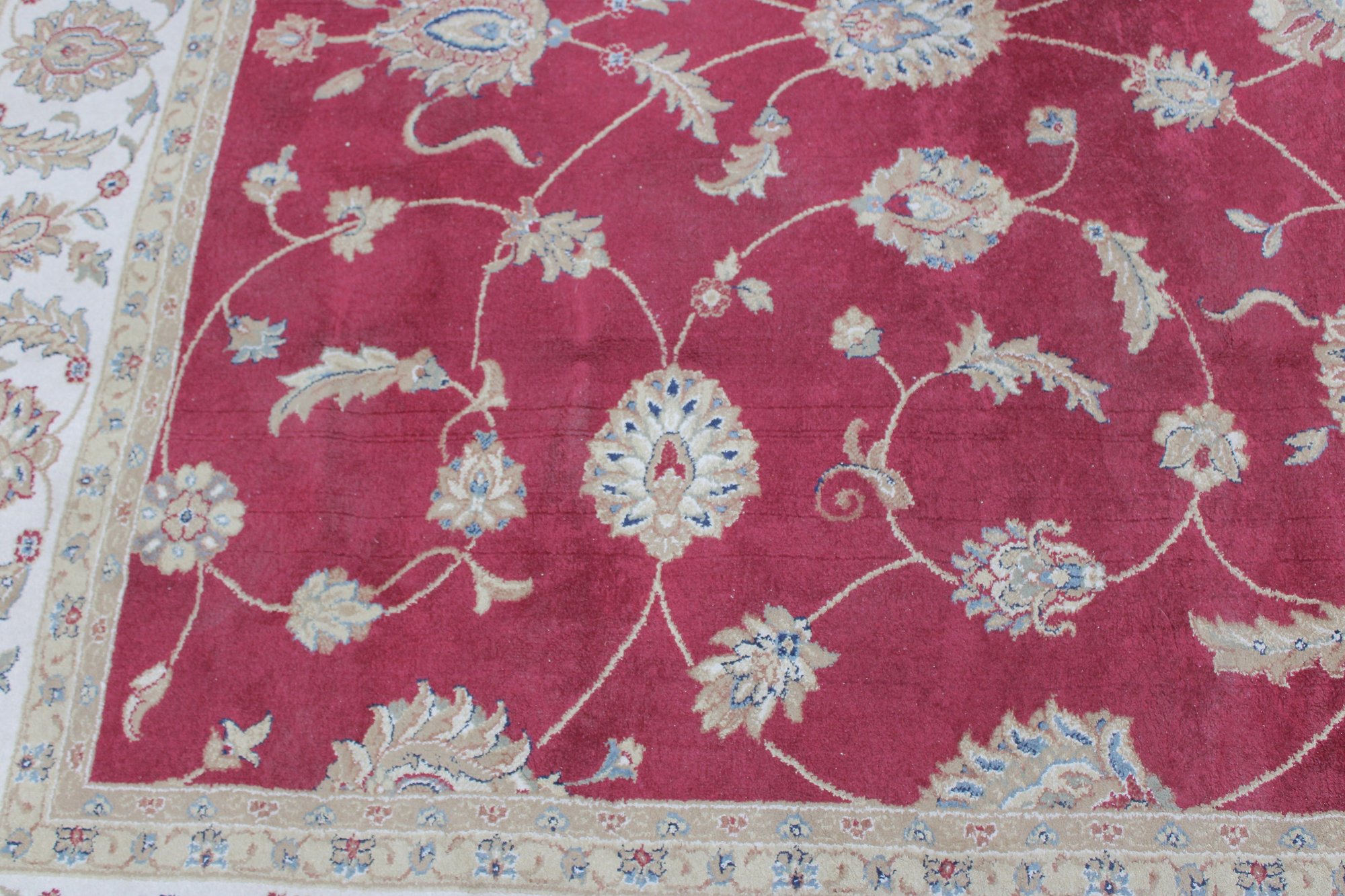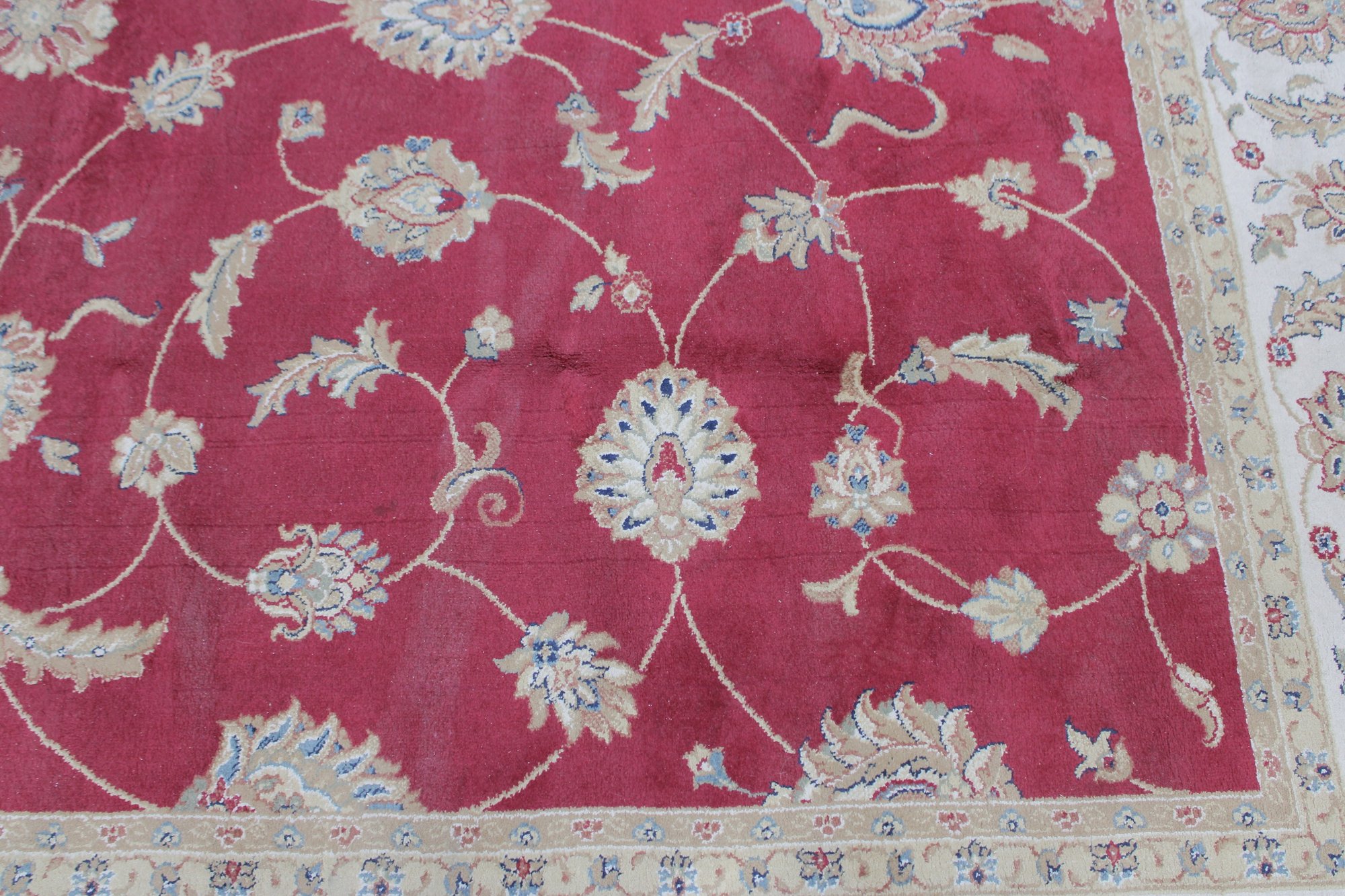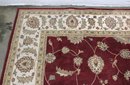 Home Decorators Collection “Claire” area rug, featuring a classic traditional floral design with rich colors and elegant detailing. The rug displays a vibrant red field with scrolling vines and floral motifs, framed by a decorative ivory border with intricate patterns.