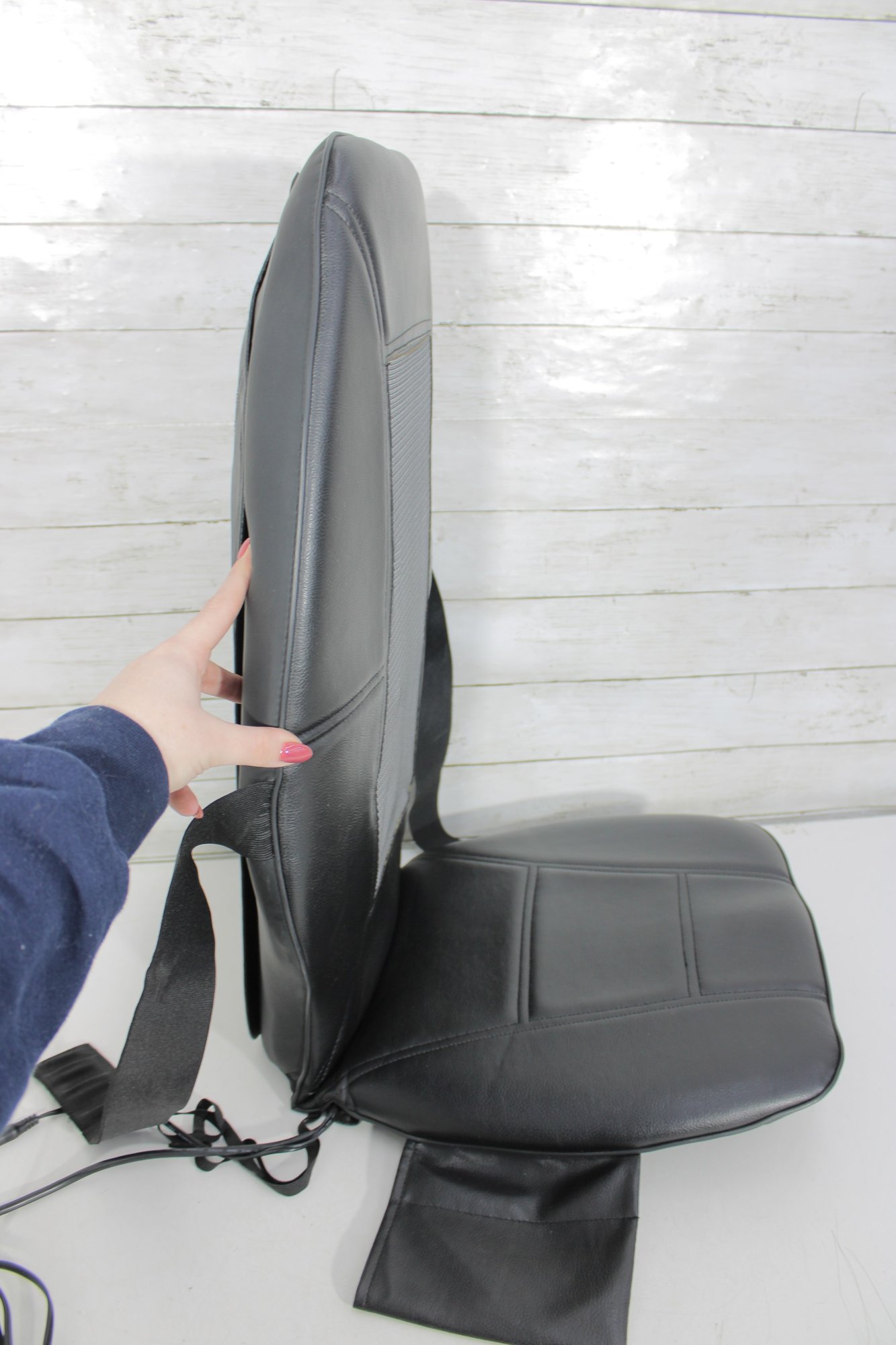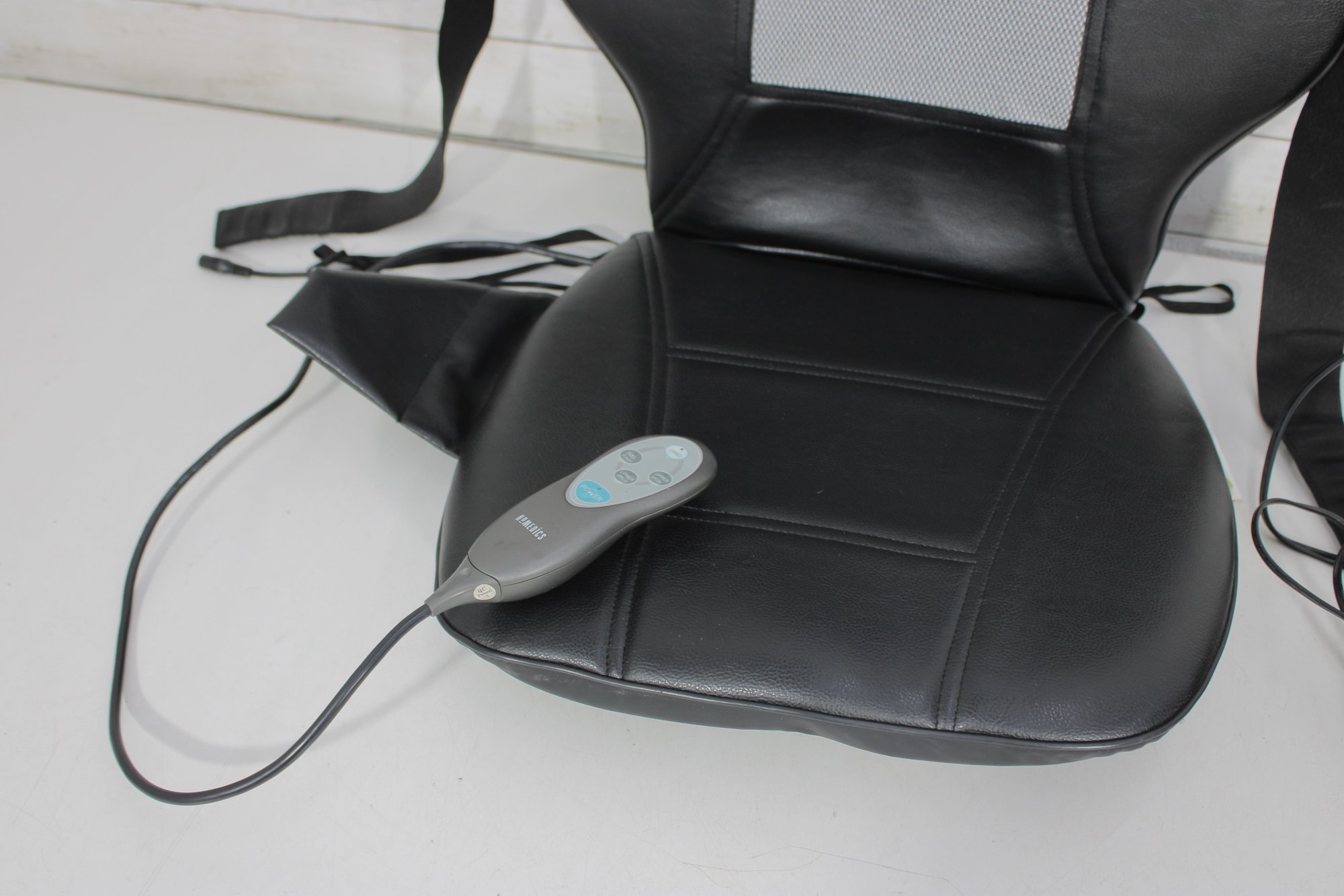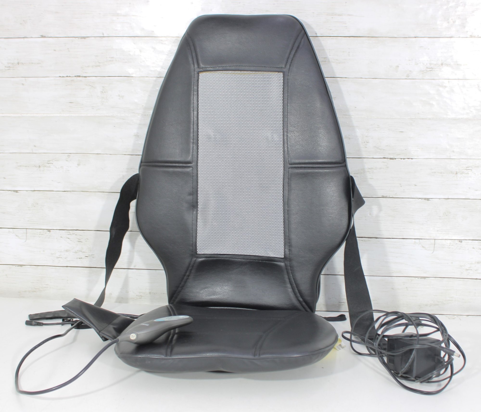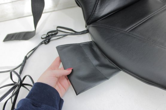 Equipped with a handheld controller, you can customize your massage experience with multiple settings. The unit has been tested and powers on as shown, offering a convenient way to enjoy soothing back relief without leaving your space.