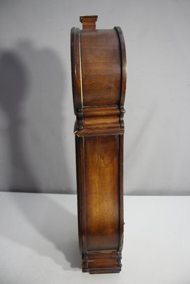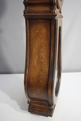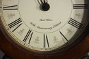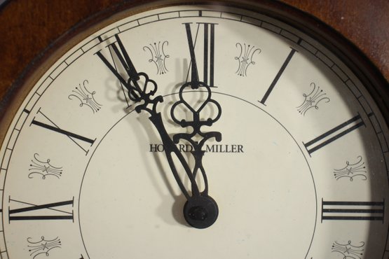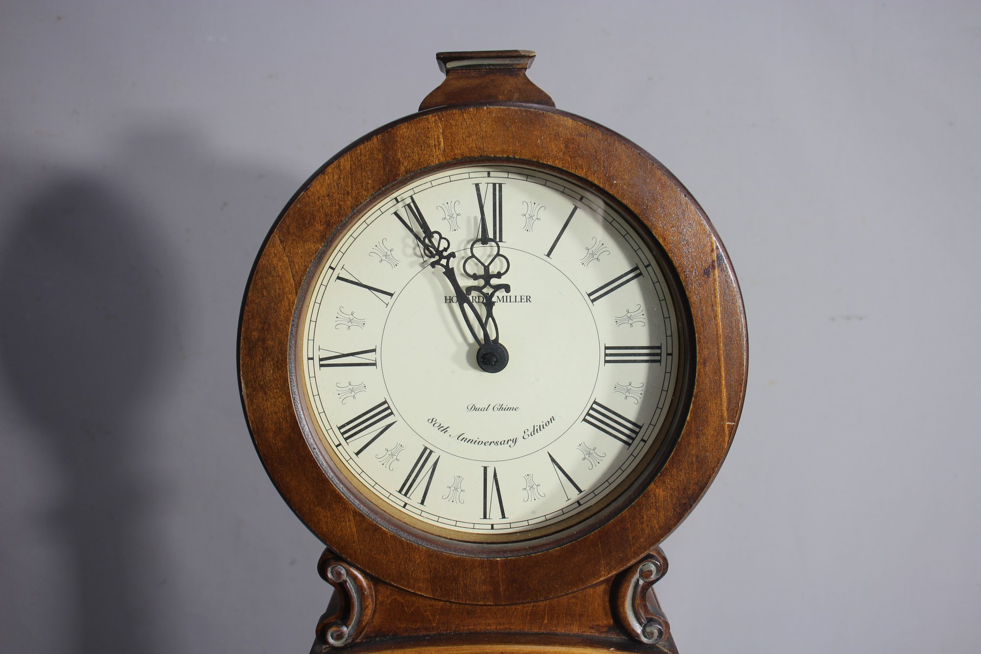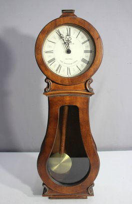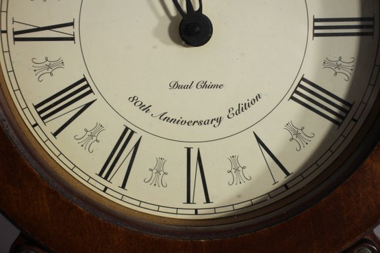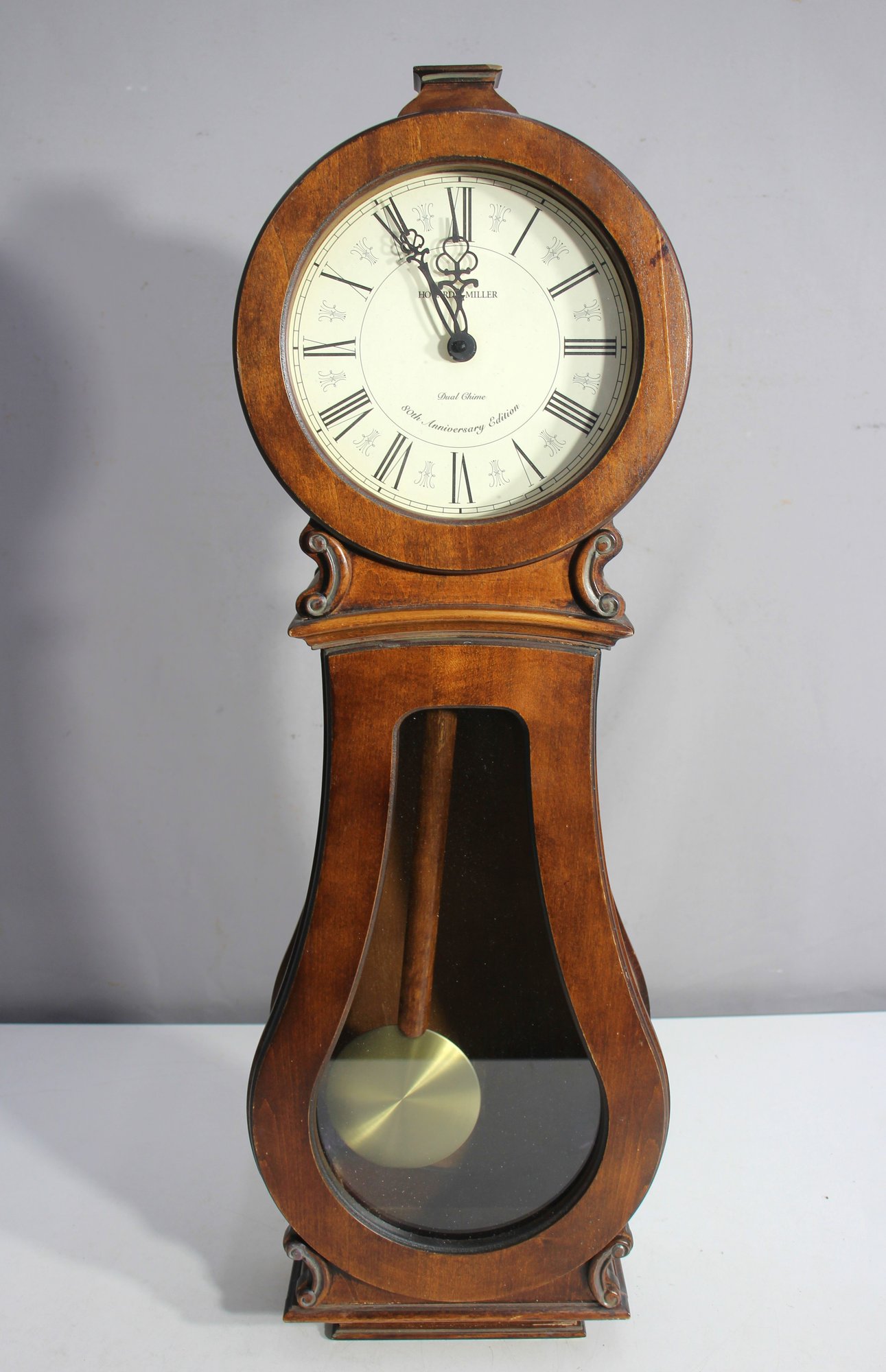 This Howard Miller 80th Anniversary Edition Wall Clock is a beautifully crafted timepiece featuring a classic wooden case with an elegant lyre-shaped design. The clock has a dual chime movement, Roman numeral dial, and a glass front panel showcasing a brass pendulum.