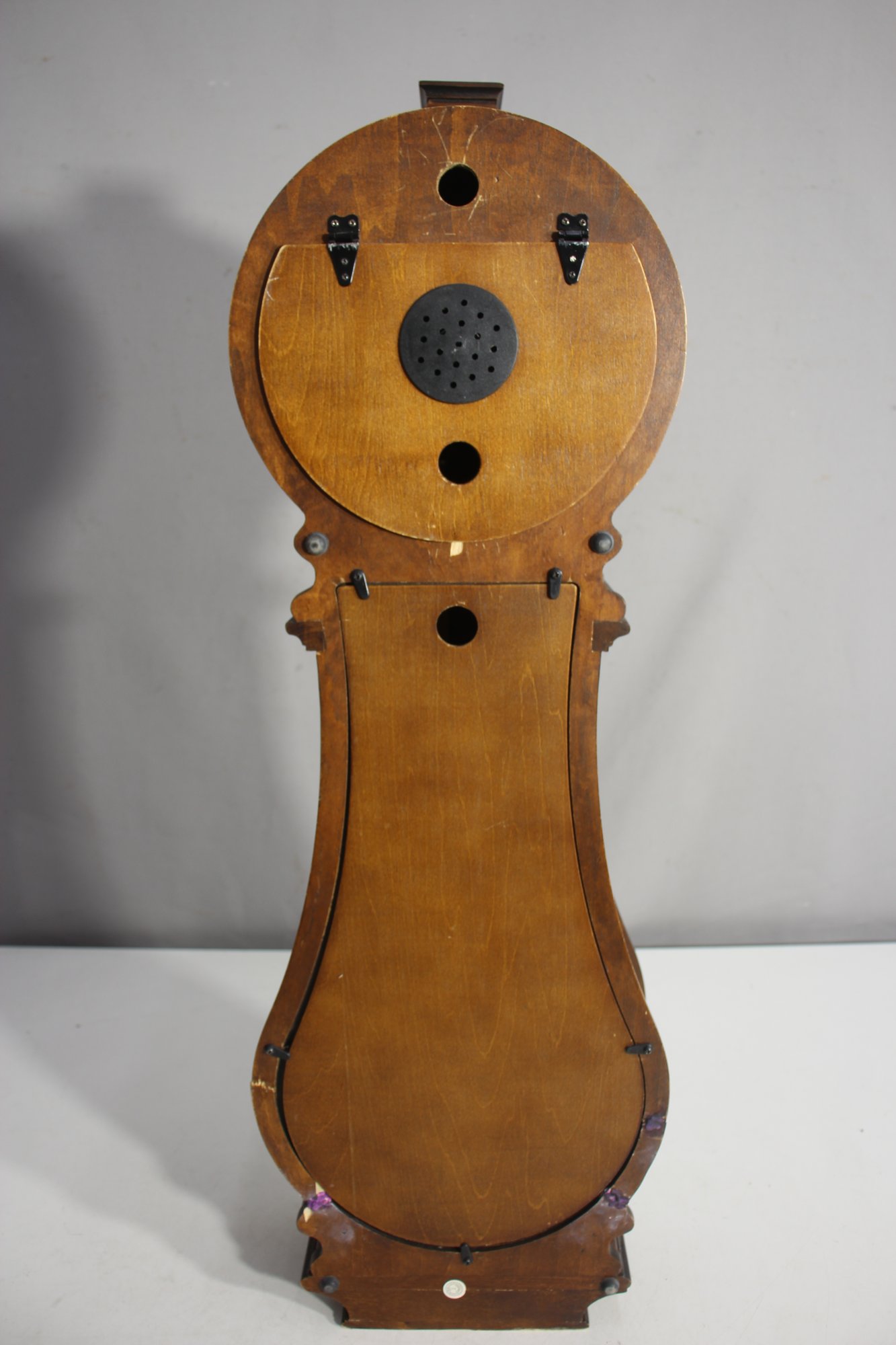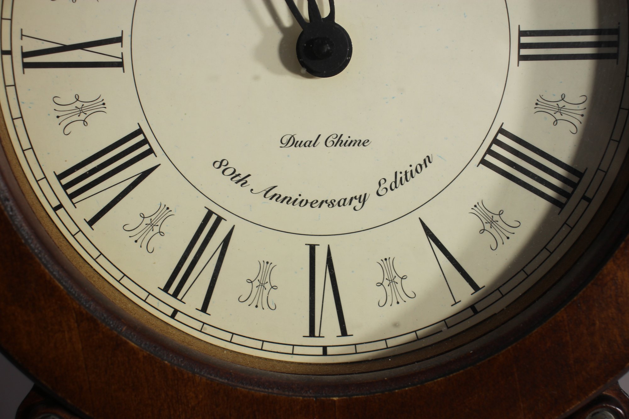 The face of the clock is marked Howard Miller, and the 80th Anniversary Edition label is visible. The back panel includes an access door for the movement, and the interior reveals its quartz movement mechanism.