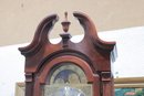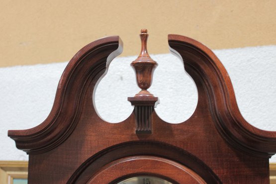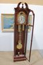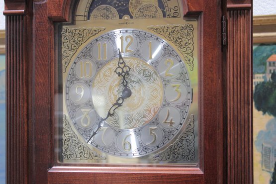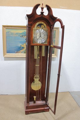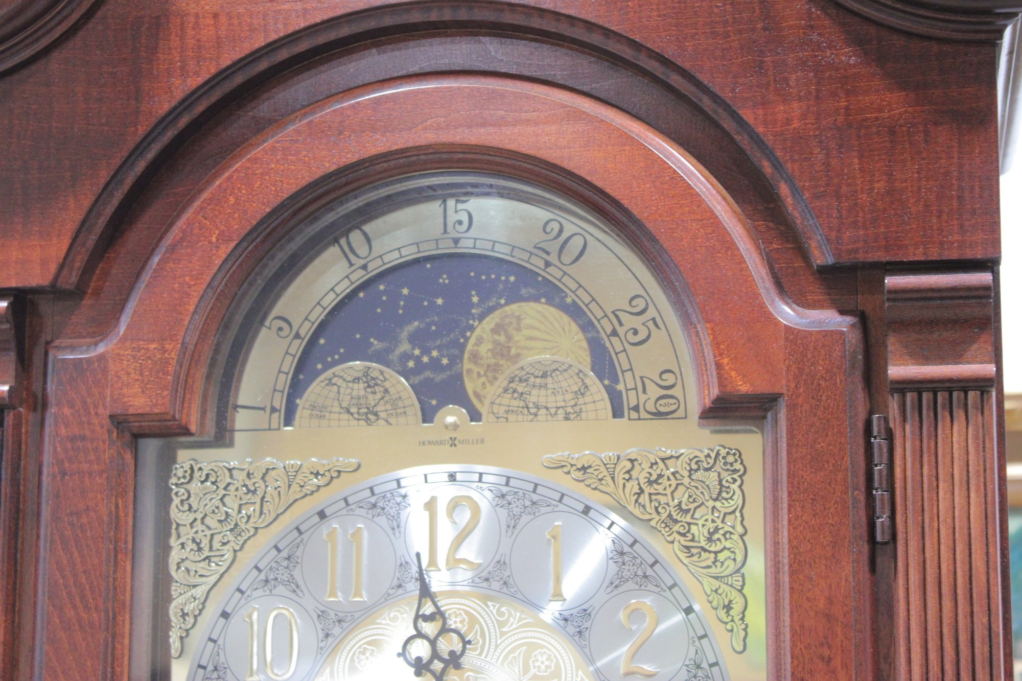 Howard Miller grandfather clock featuring a classic traditional wood case, arched bonnet top, and decorative moon phase dial. This tall case clock showcases a brass-tone pendulum and weights visible through the glass front door, making it a timeless statement piece for any home or office.