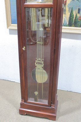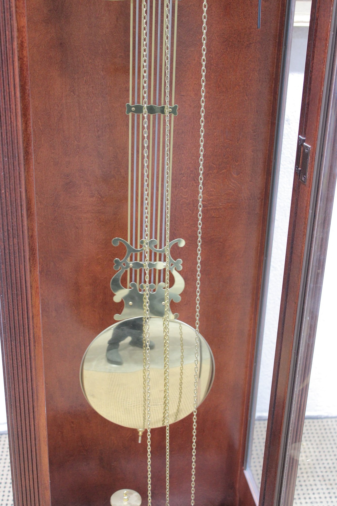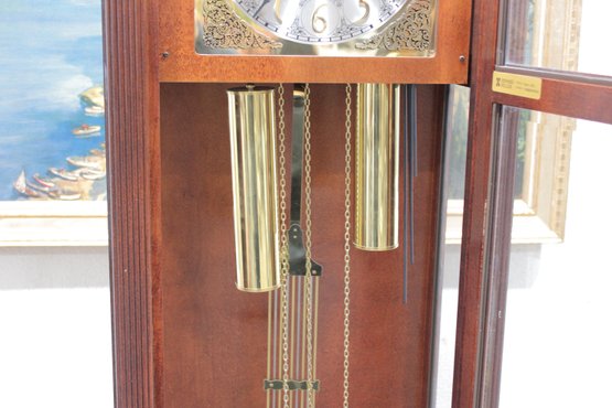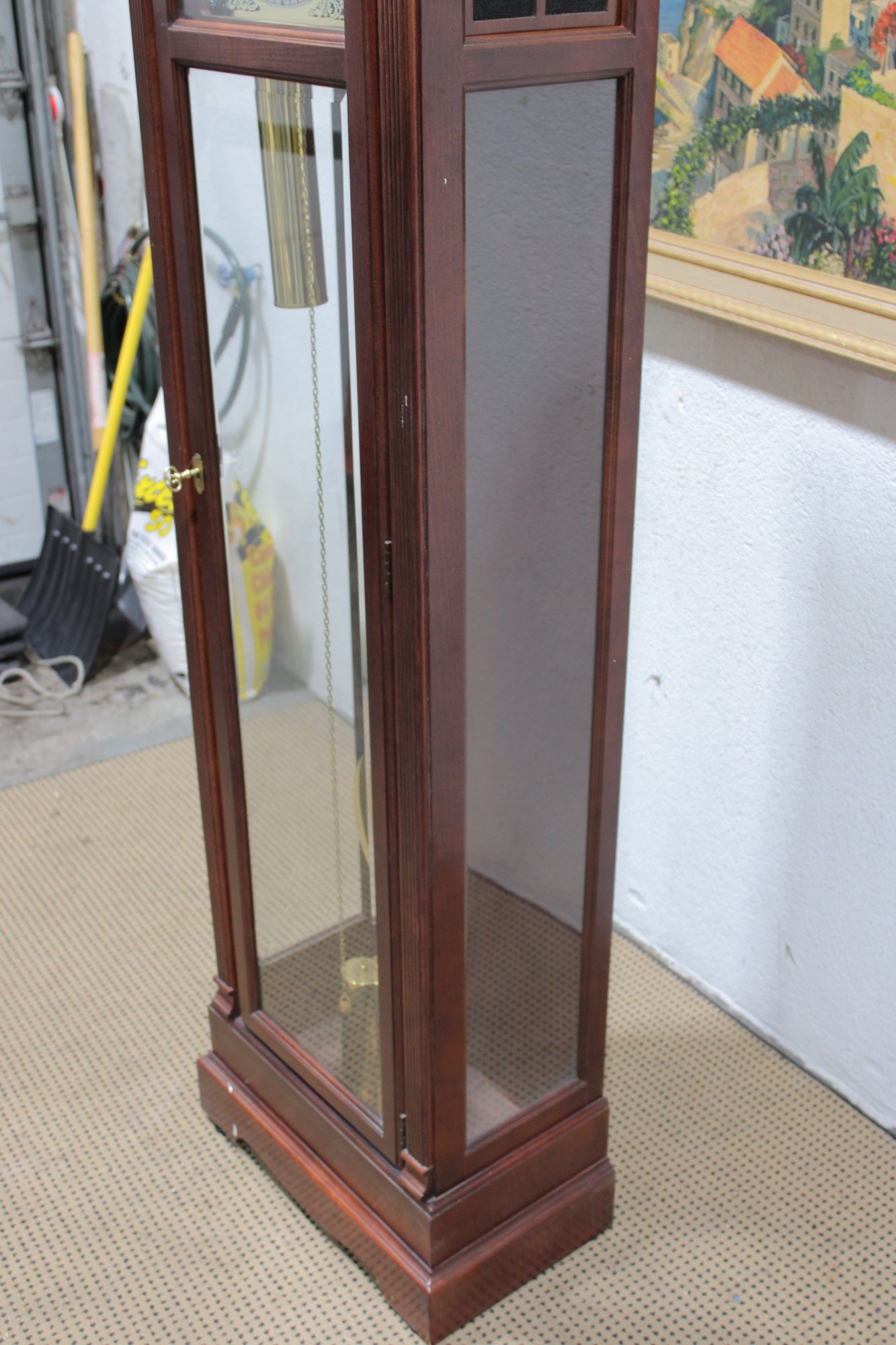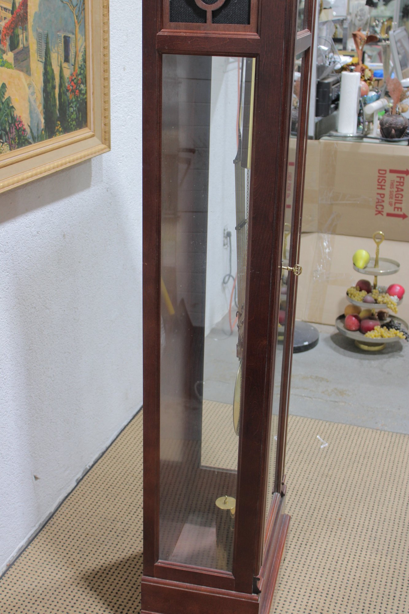 The richly finished wood cabinet includes detailed columns, glass panels, and a hinged front door for easy access. Known for their quality craftsmanship, Howard Miller clocks are highly collectible and sought after for both décor and restoration projects.