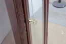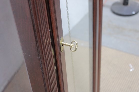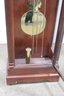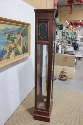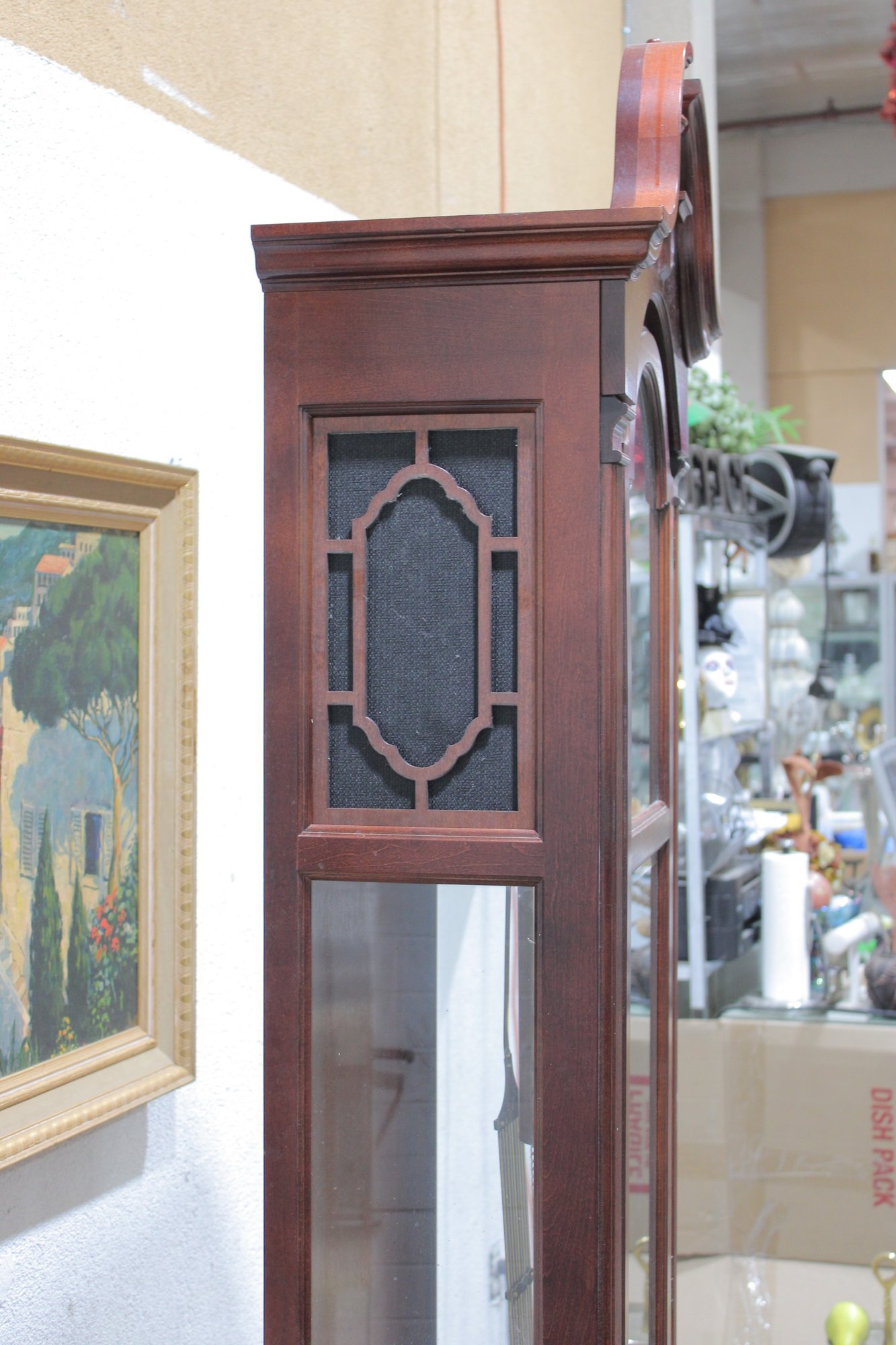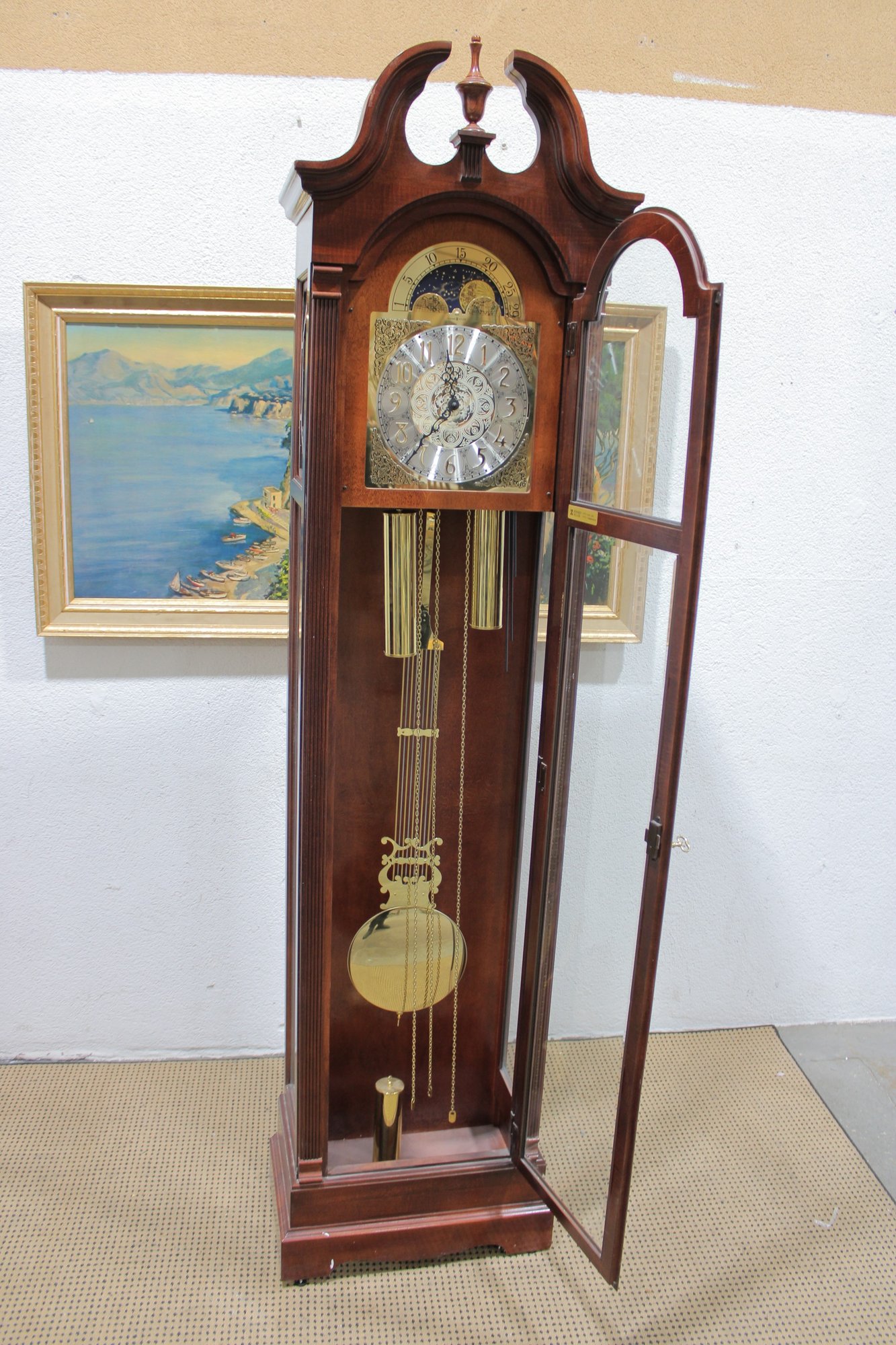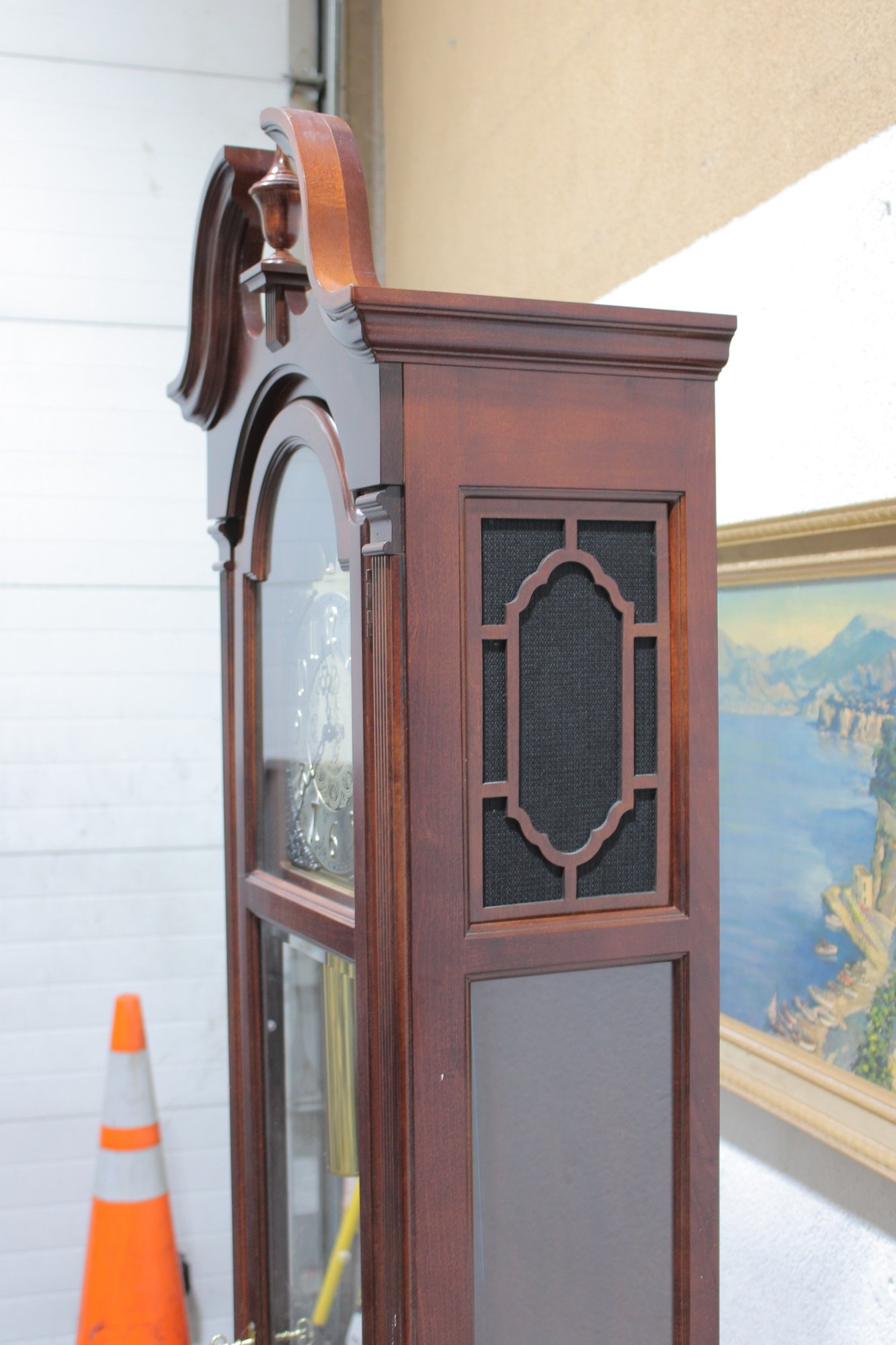 The richly finished wood cabinet includes detailed columns, glass panels, and a hinged front door for easy access. Known for their quality craftsmanship, Howard Miller clocks are highly collectible and sought after for both décor and restoration projects.