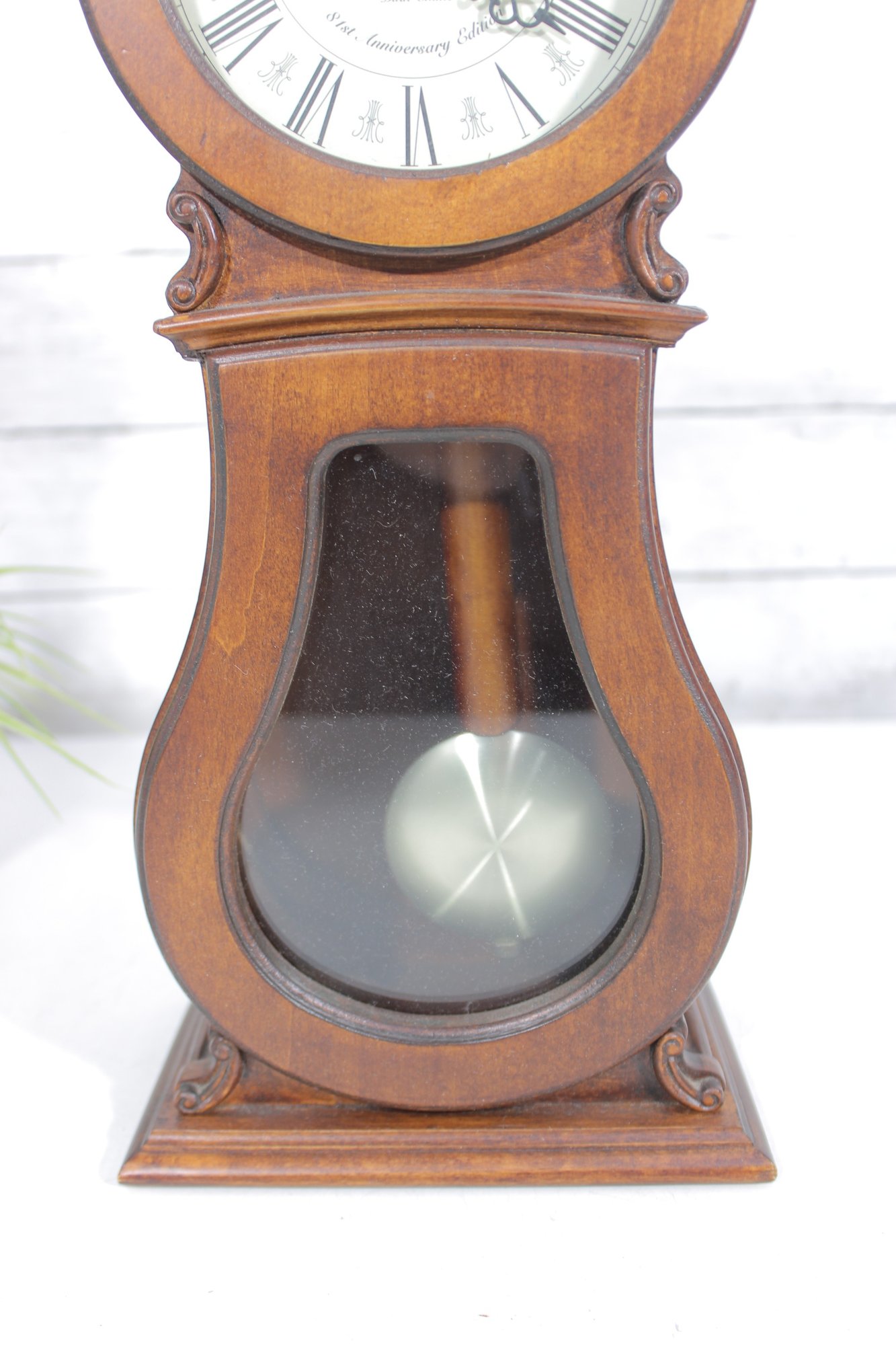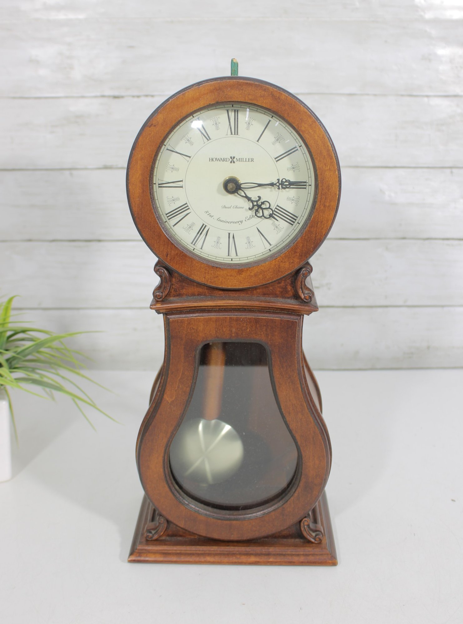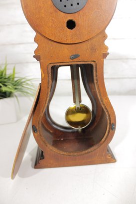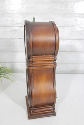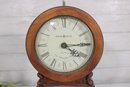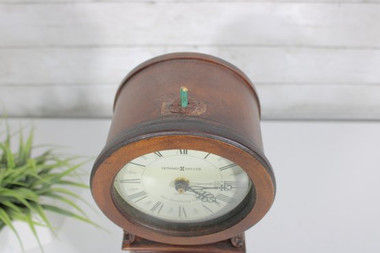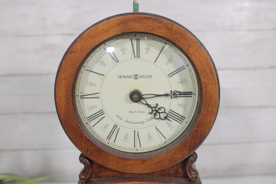 Classic Howard Miller mantel clock featuring a traditional wood case with a warm finish and elegant curved silhouette. The clock has a clean, easy-to-read dial with Roman numerals and ornate hands, complemented by a lower glass window showcasing the decorative pendulum.