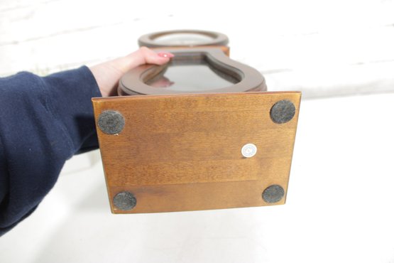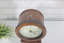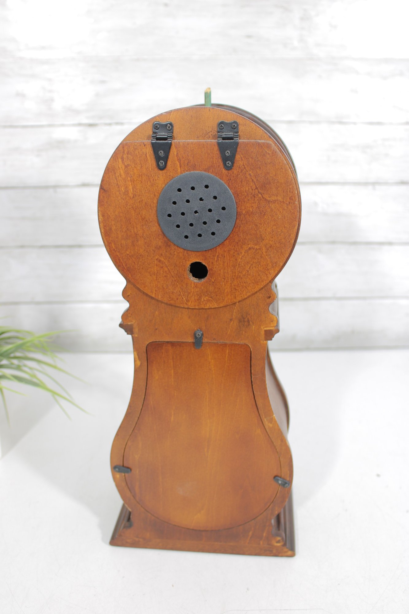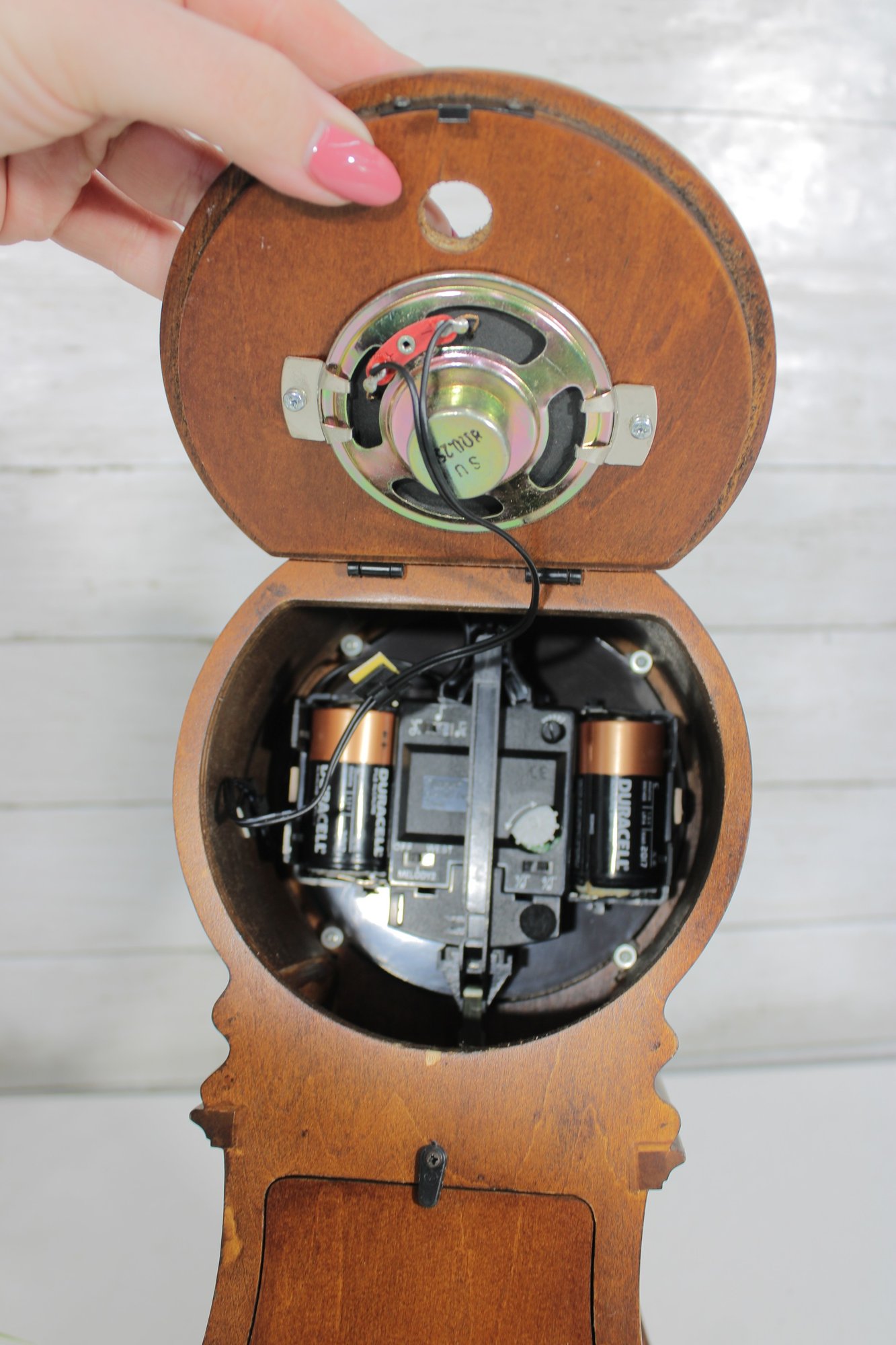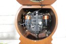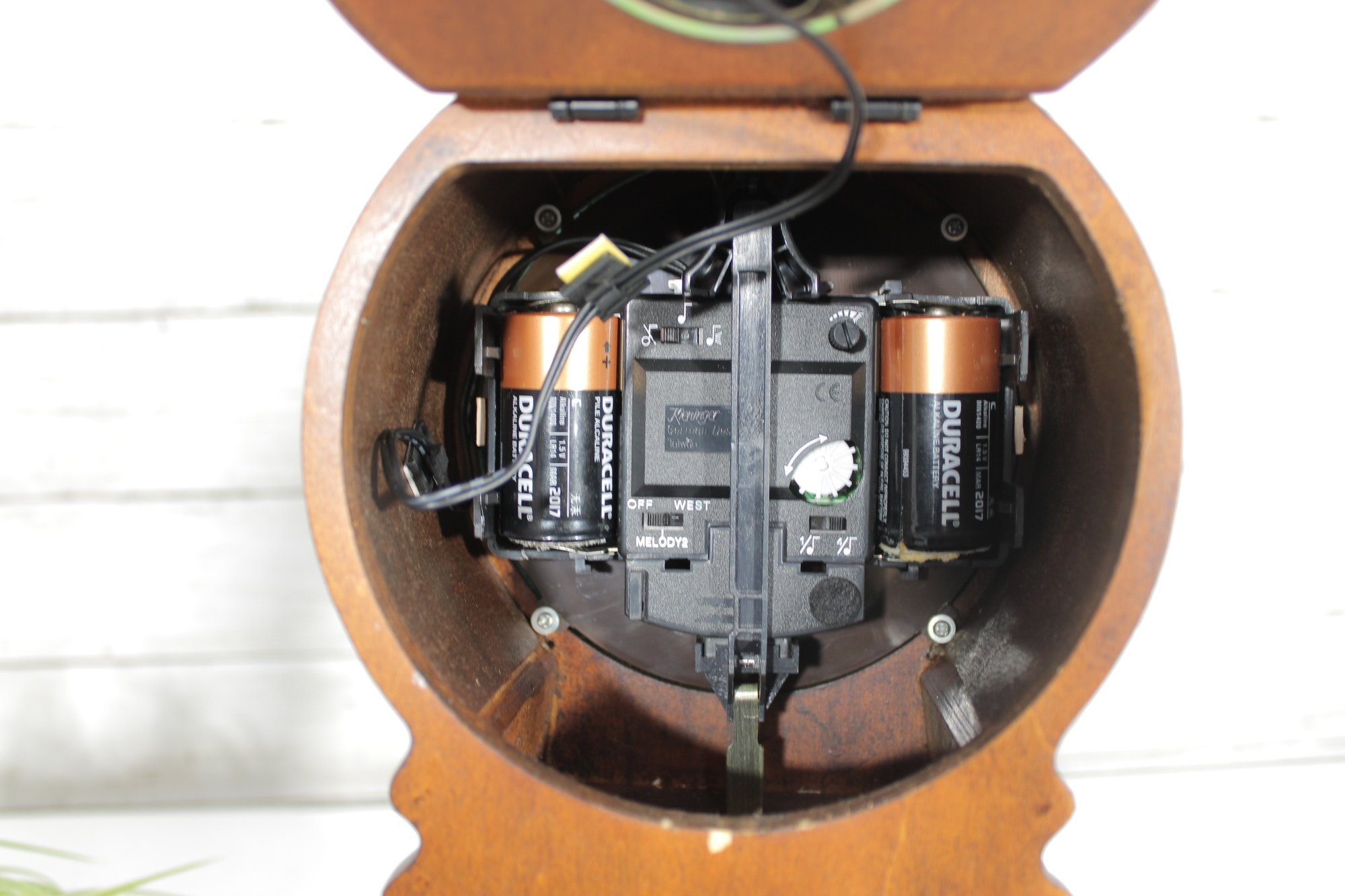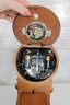 The interior houses a battery-operated quartz movement, visible from the back compartment, combining classic design with modern convenience.