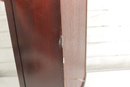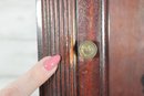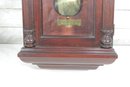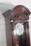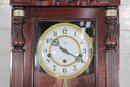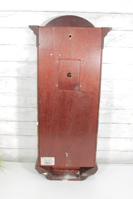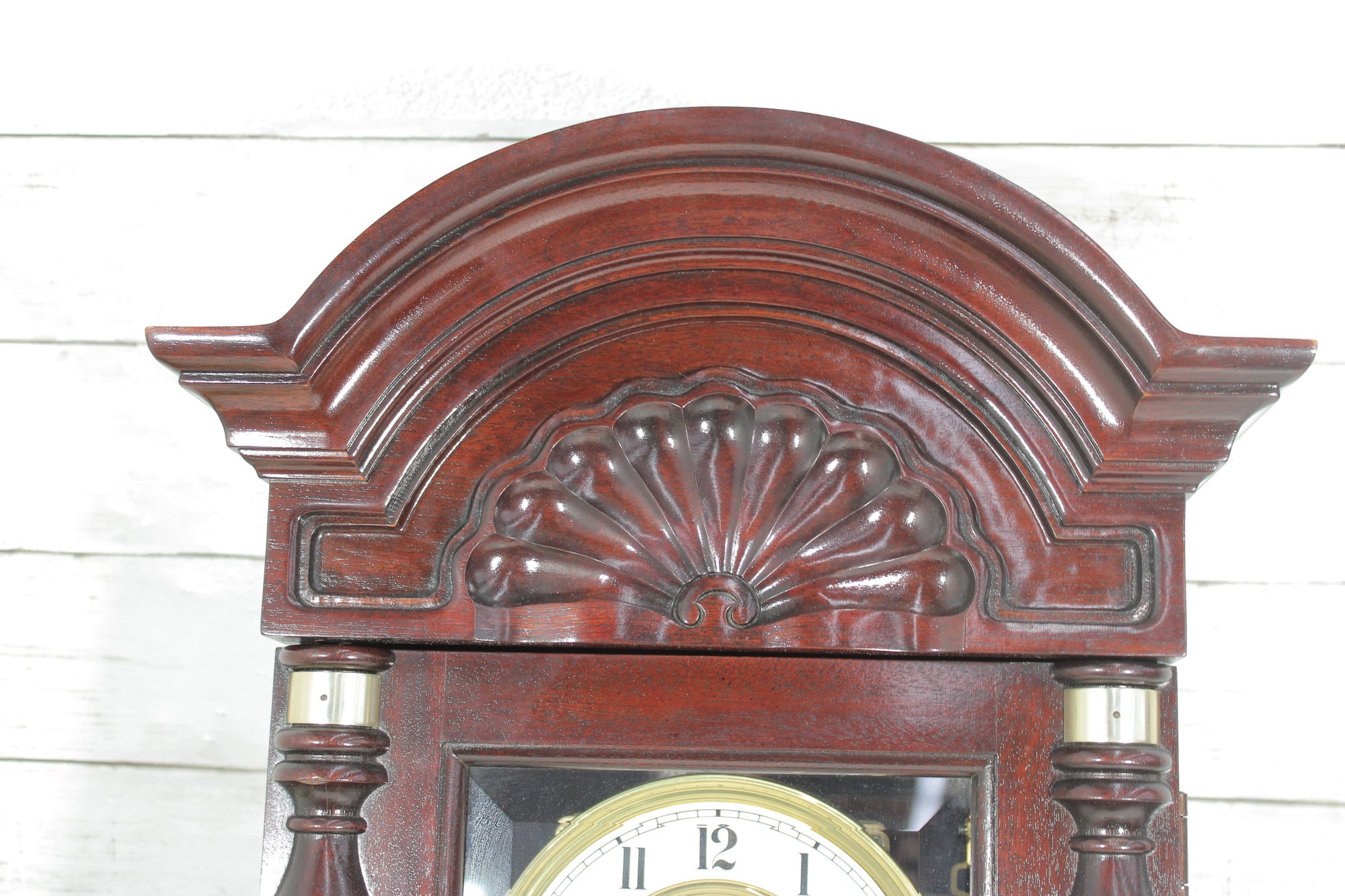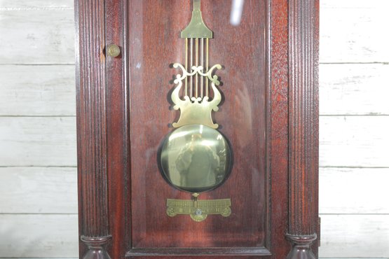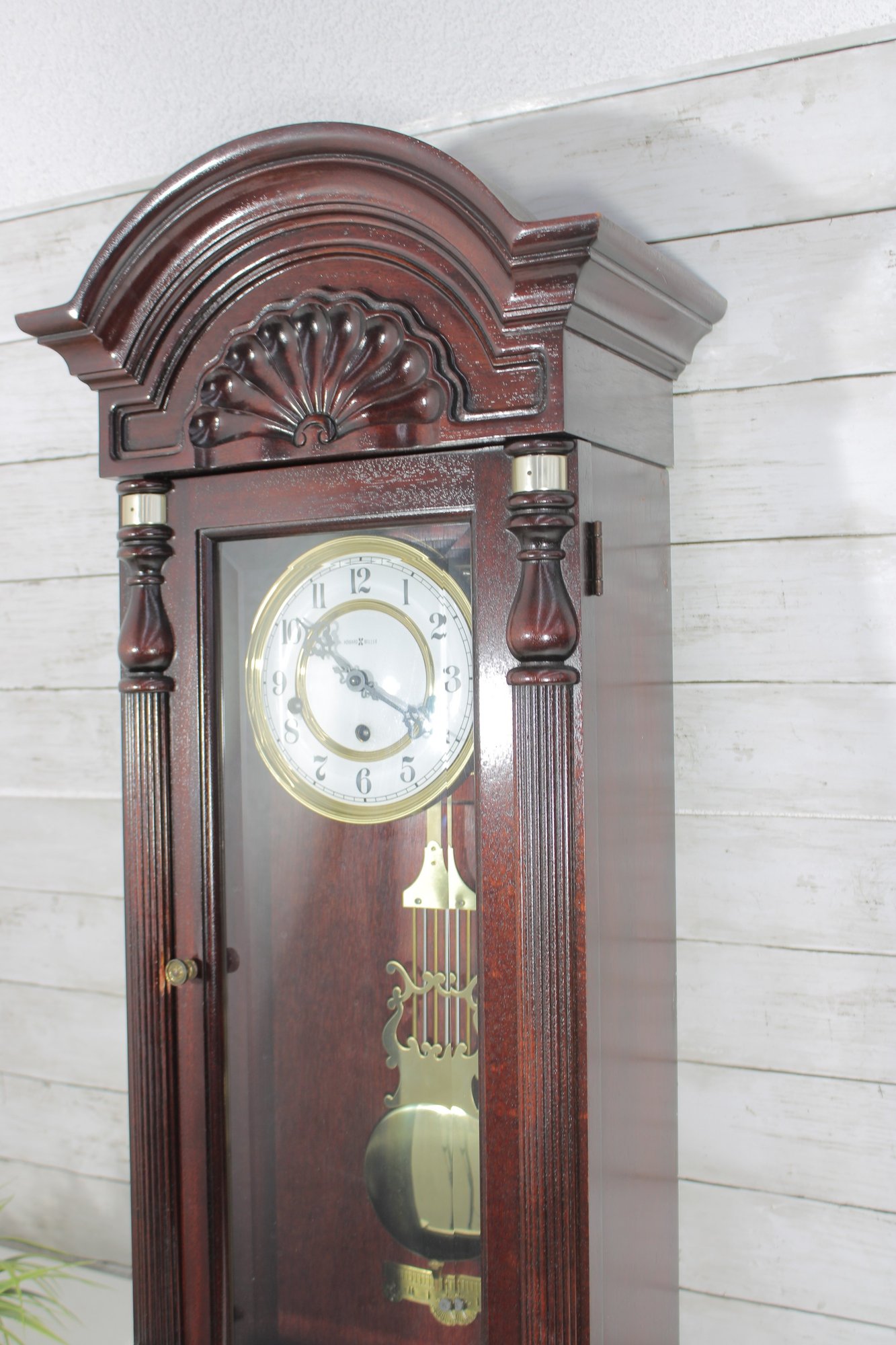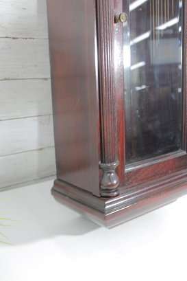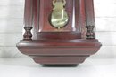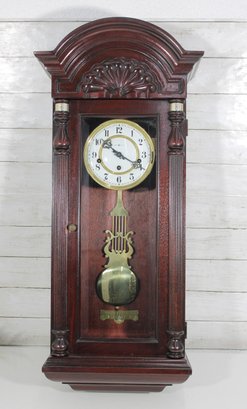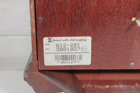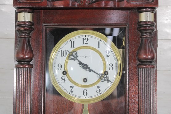 Howard Miller wall clock featuring a classic cherry wood finish and traditional design. The case is beautifully detailed with a decorative arched top, carved accents, and fluted columns, giving it a timeless and sophisticated appearance.