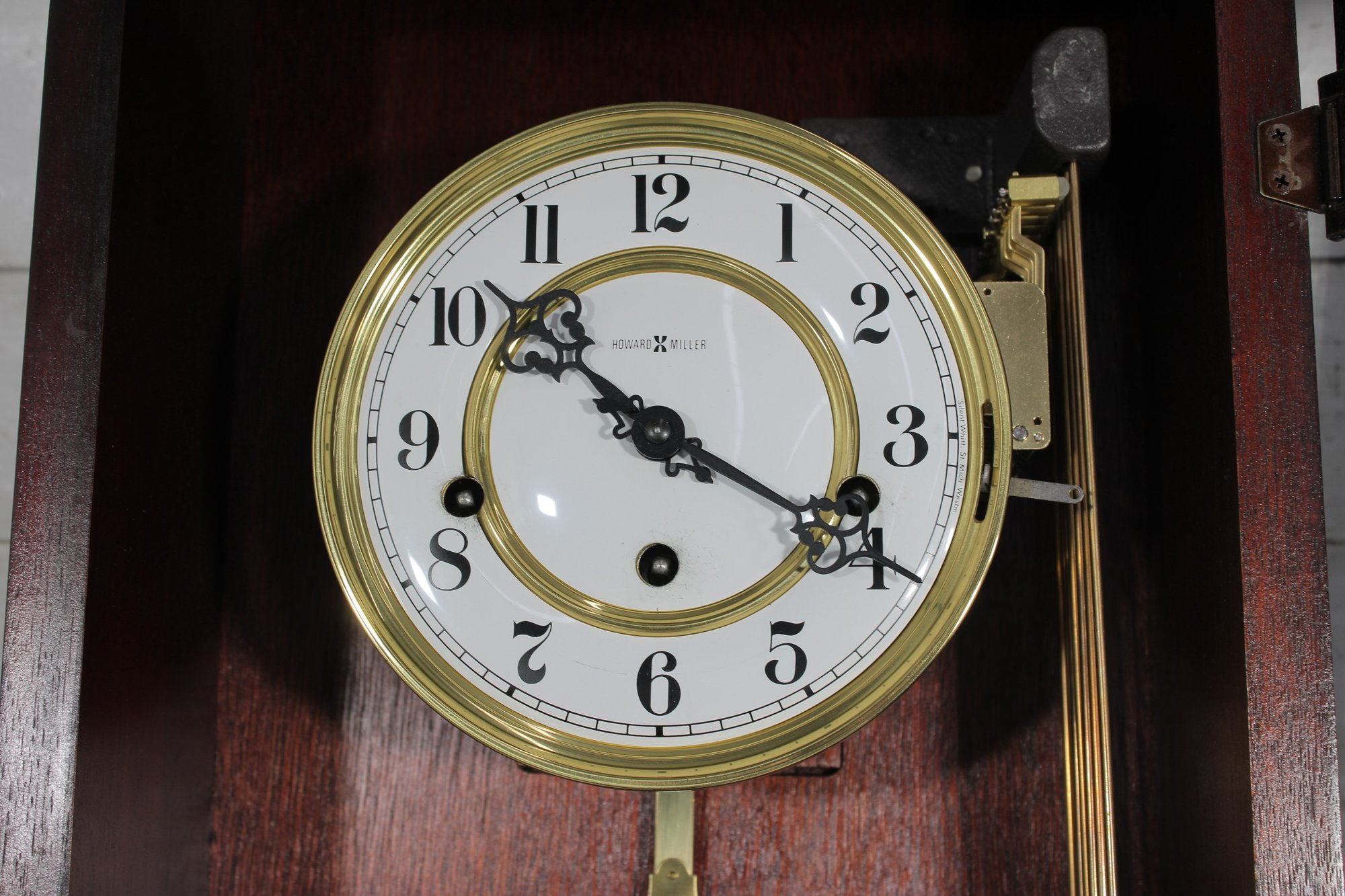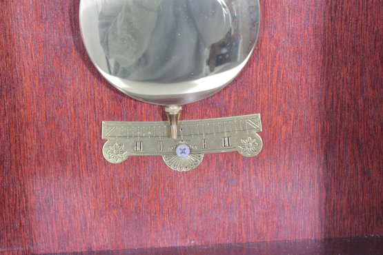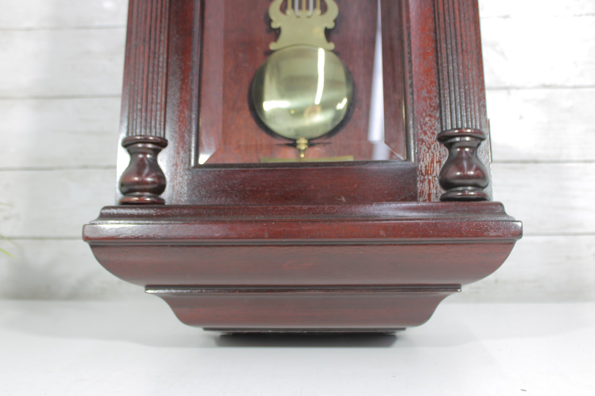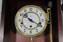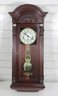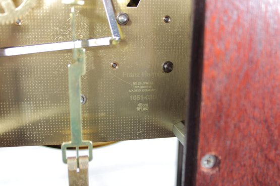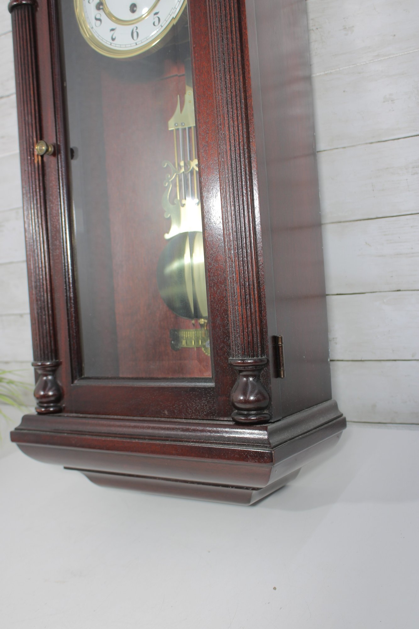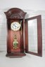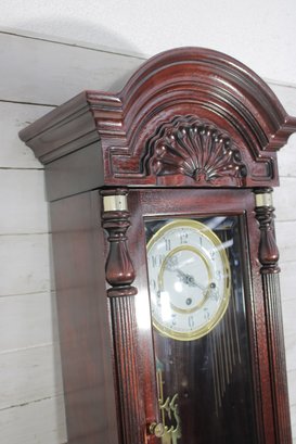 The clock features a clear glass front door that showcases the brass-tone pendulum and dial. The face displays Arabic numerals with ornate hands, making it both functional and stylish.