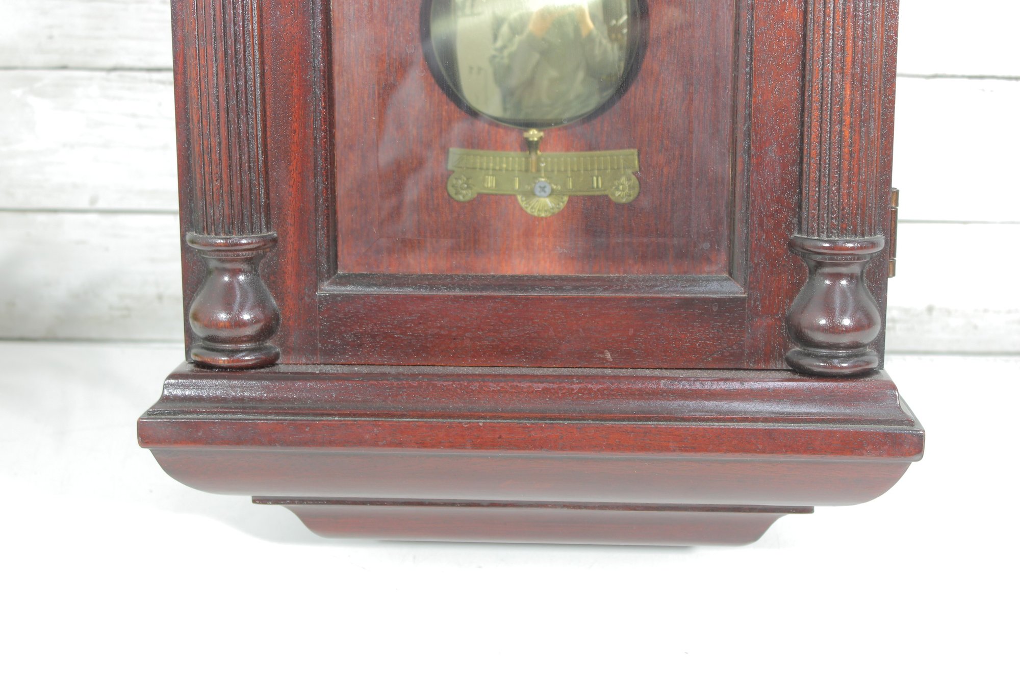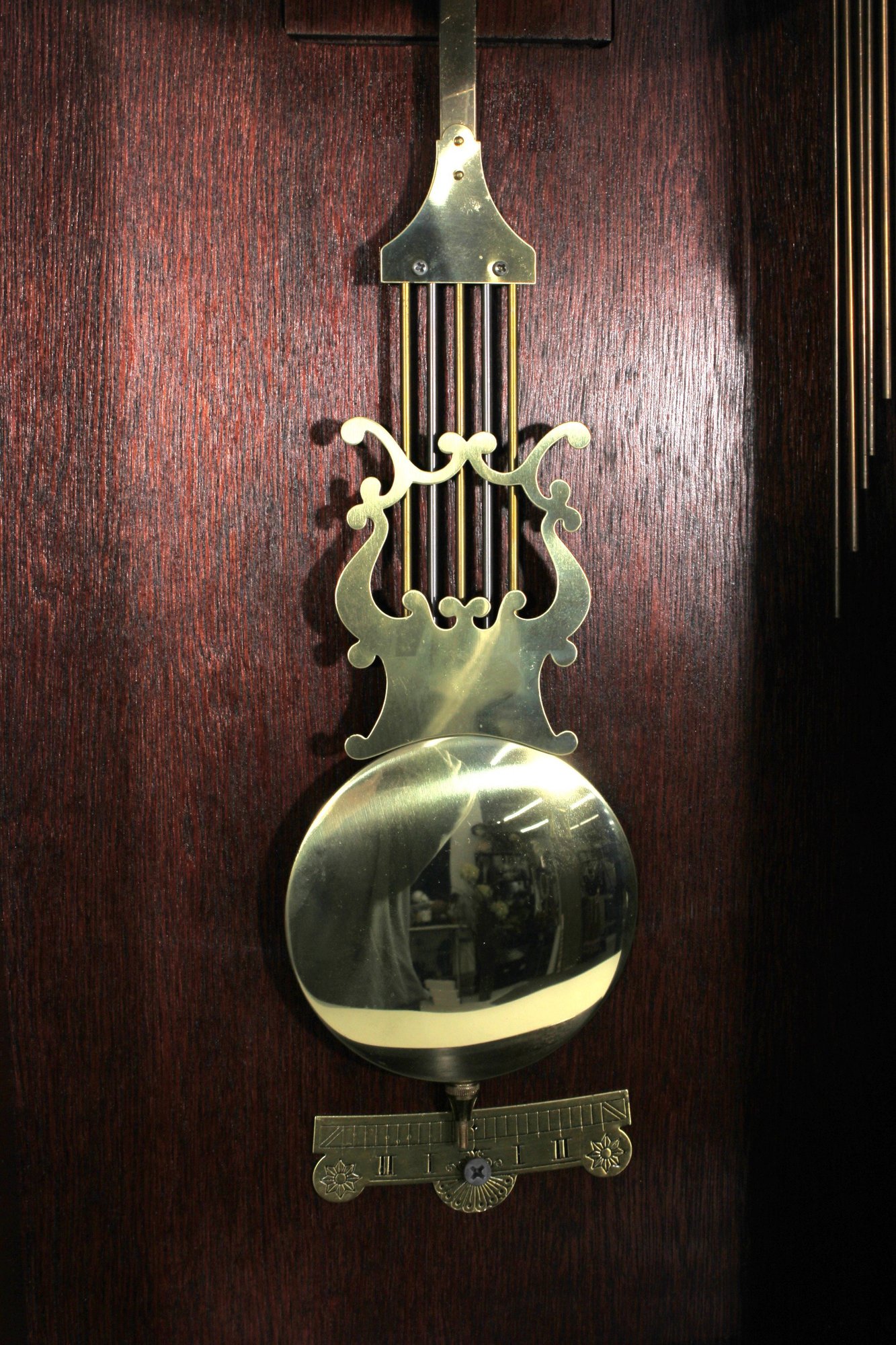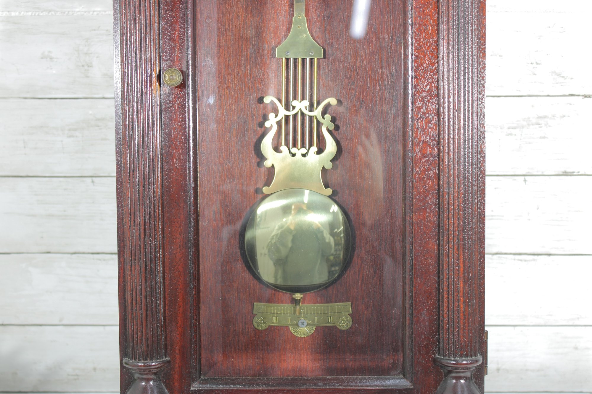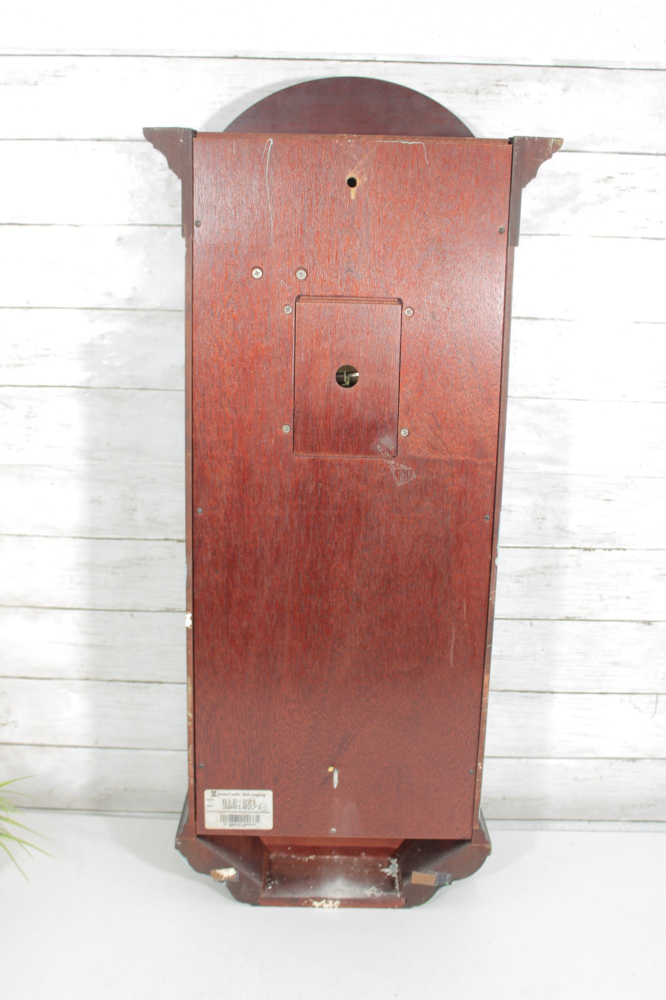 The clock features a clear glass front door that showcases the brass-tone pendulum and dial. The face displays Arabic numerals with ornate hands, making it both functional and stylish.