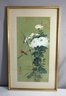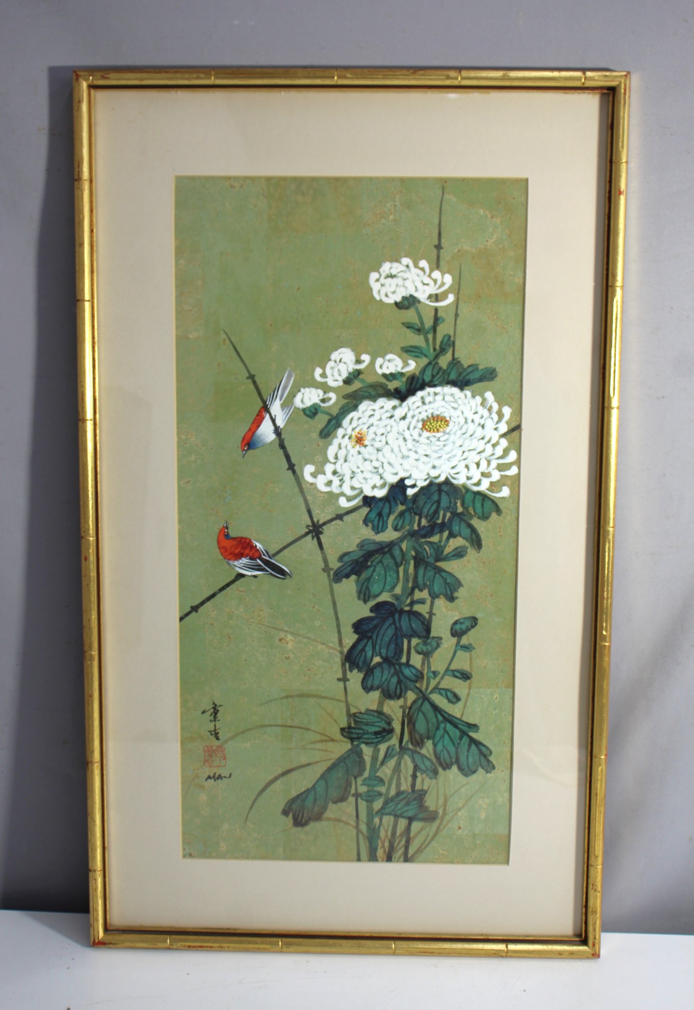 This exquisite watercolor painting by renowned Chinese artist Hui-Chi Mau captures the delicate beauty of nature. Featuring a pair of vibrant birds perched among large white chrysanthemums on a soft green background, this piece showcases the artist's refined skill and attention to detail. The composition has a calming elegance, making it an ideal addition to any art collection or interior decor.