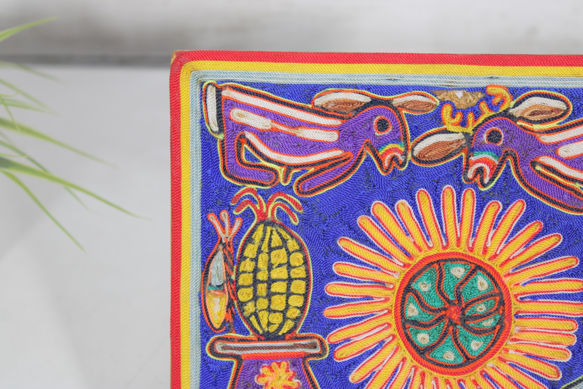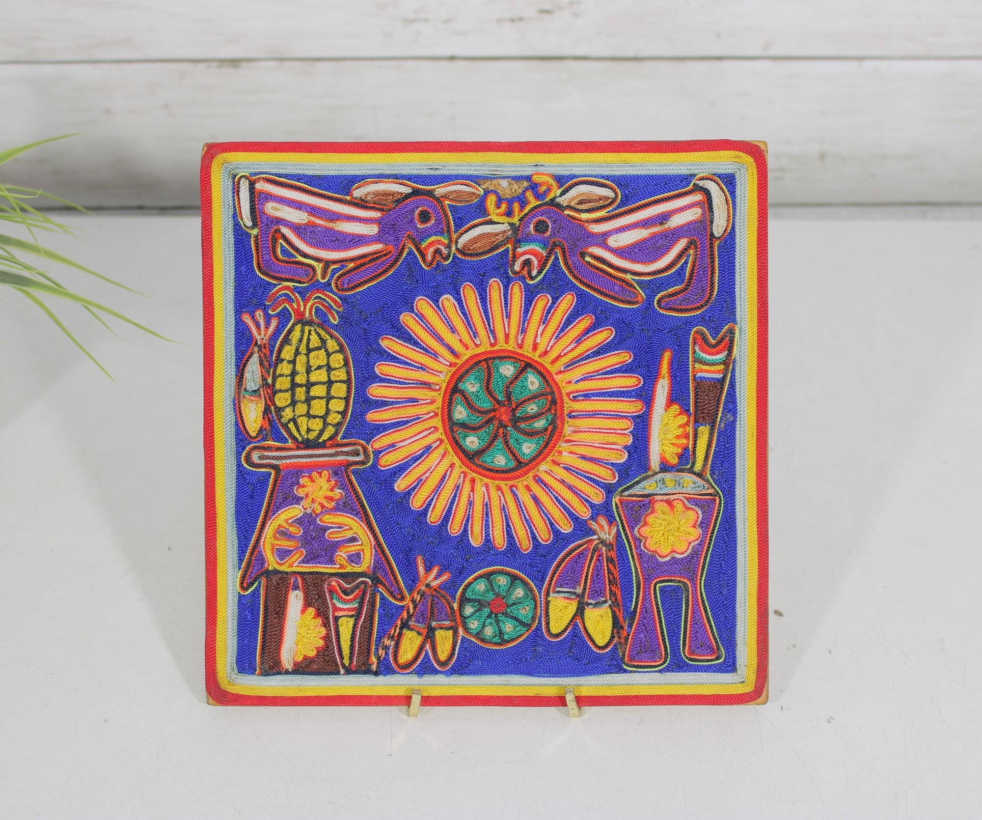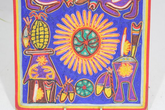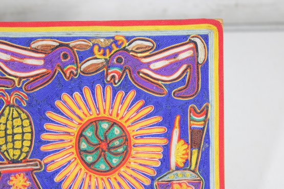 Vibrant Huichol-style yarn painting featuring bold colors and intricate symbolic designs. This handcrafted folk art piece showcases traditional imagery including animals, sun motifs, and geometric elements, all created with carefully applied yarn for a richly textured surface.