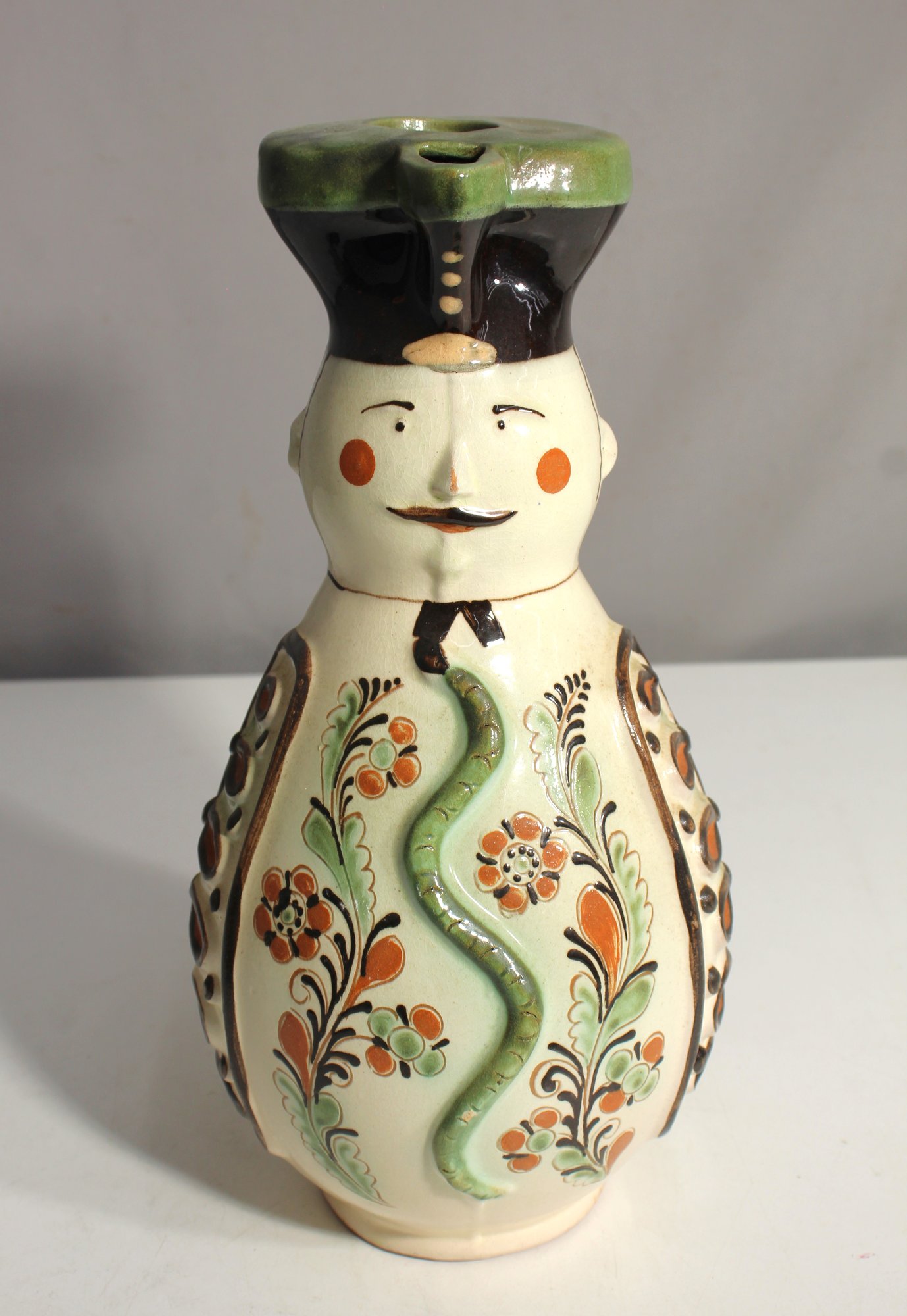 Beautiful hand-painted Hungarian pottery pitcher featuring a whimsical figure with traditional Kalocsa floral designs. Standing at 13.5 inches tall, this unique piece showcases vibrant colors and intricate details, perfect for collectors of Hungarian folk art or fans of hand-crafted pottery. Marked "Kalocsa" and stamped "Hand Made in Hungary" on the base.