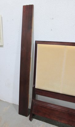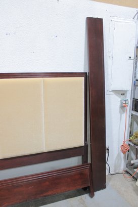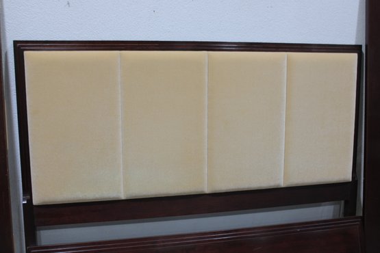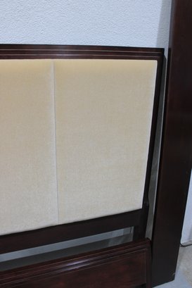 This piece showcases a warm-toned wood frame with clean lines and a softly padded headboard upholstered in a neutral fabric. The design blends traditional and contemporary elements, making it a versatile addition to a variety of bedroom styles.
