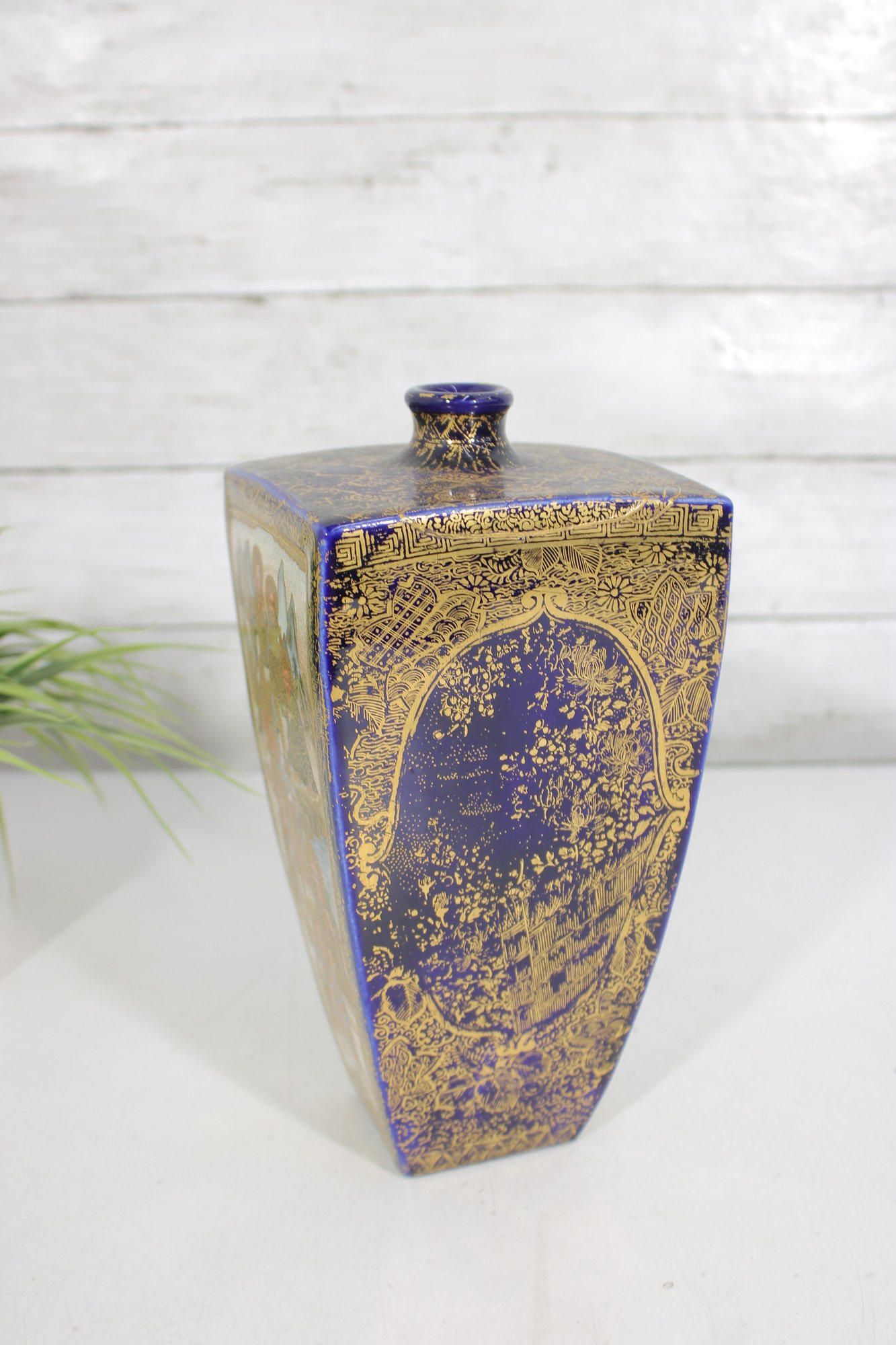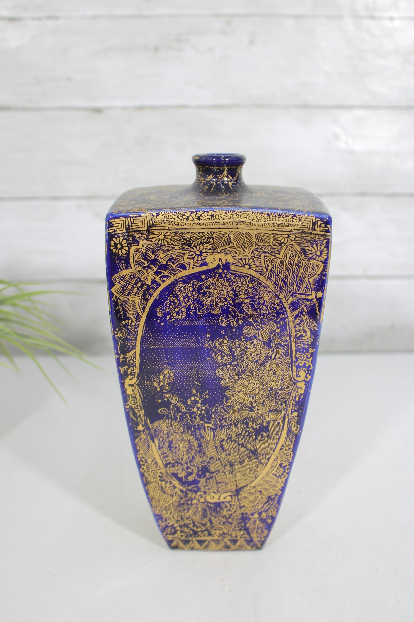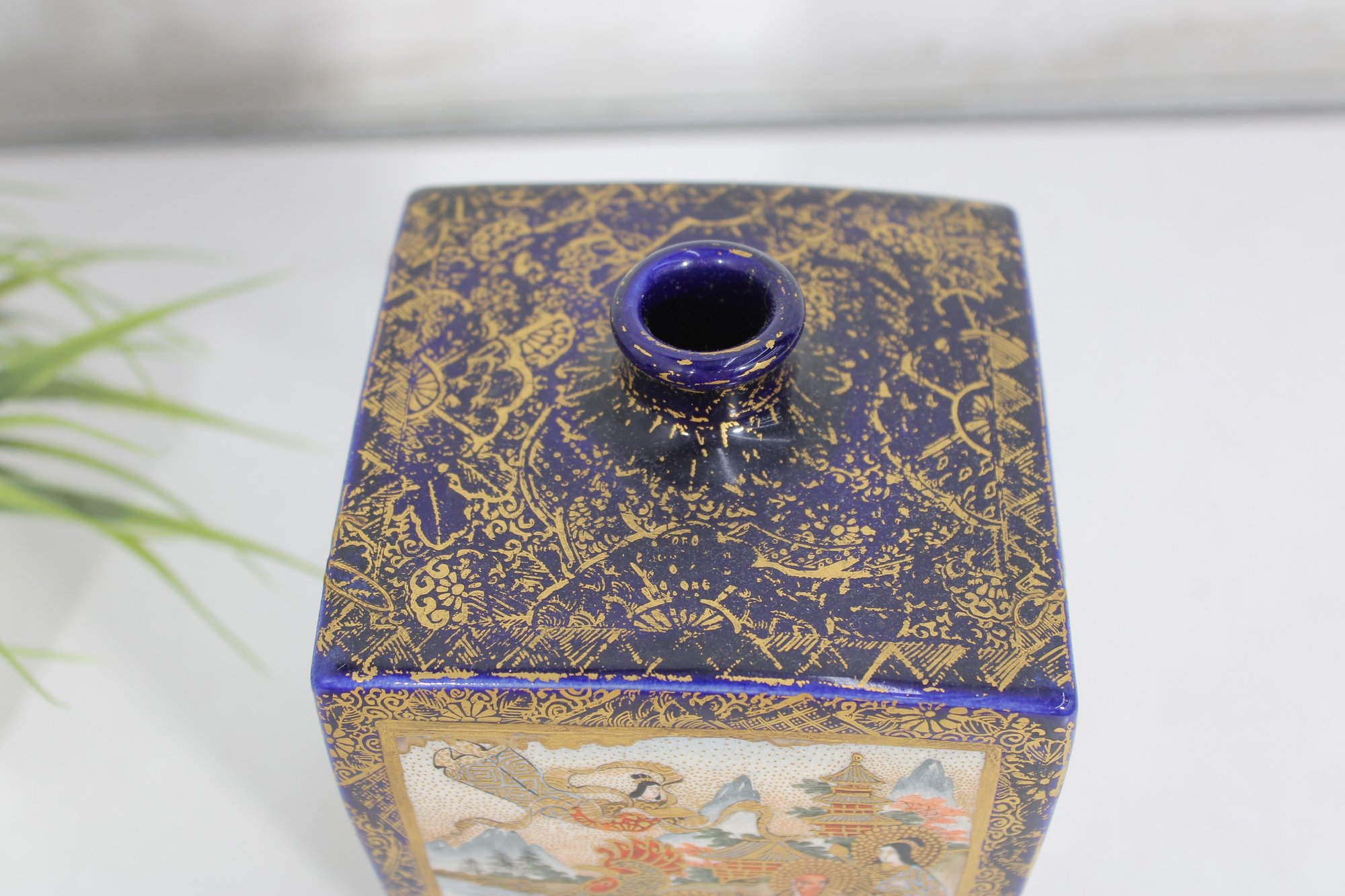 The contrast between the vivid blue background and the elaborate gold enamel work highlights the exceptional craftsmanship associated with Satsuma ware. The narrow neck and geometric tapering body give the piece a refined and architectural silhouette.